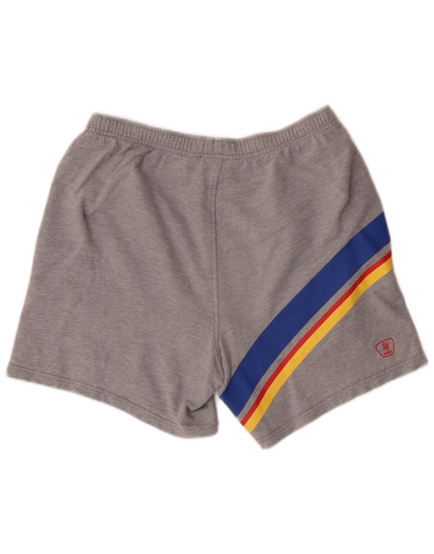 - AI Description: These Puma men's athletic shorts are crafted from soft grey knit cotton for a comfortable feel. The regular fit and pull-on closure ensure ease of wear. Featuring side pockets and an elasticated waist, they offer practical comfort. A graphic strap detail on the side adds a sporty accent. The Puma logo is embroidered on the left leg. These shorts are ideal for athletics and casual wear.