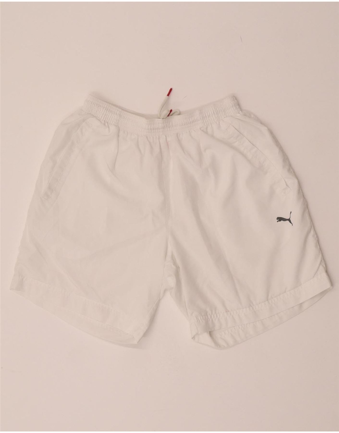 - AI Description: This Puma mens shorts are crafted from a lightweight woven fabric in crisp white. They feature a comfortable elastic waist with a pull on closure. The regular fit ensures ease of movement. Practical zipped pockets offer secure storage. A subtle Puma logo provides signature branding. Ideal for running and other sports activities.