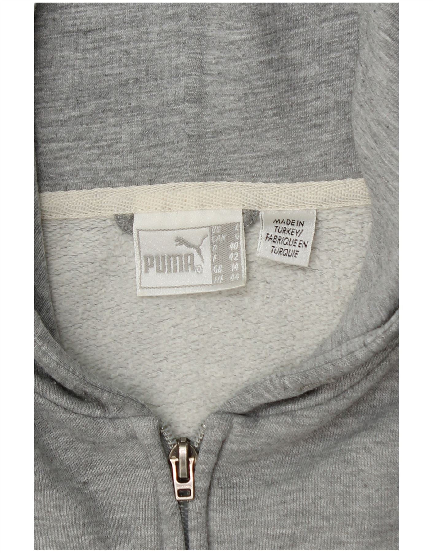 - AI Description: This Puma womens zip hoodie sweater is crafted from a soft grey knit fleece fabric. It features a full zip closure and a comfortable hooded neckline. Long sleeves and a regular fit ensure ease of wear. Practical front pockets add functionality. A subtle Puma logo provides signature branding. This versatile piece offers casual comfort and a classic athletic style.