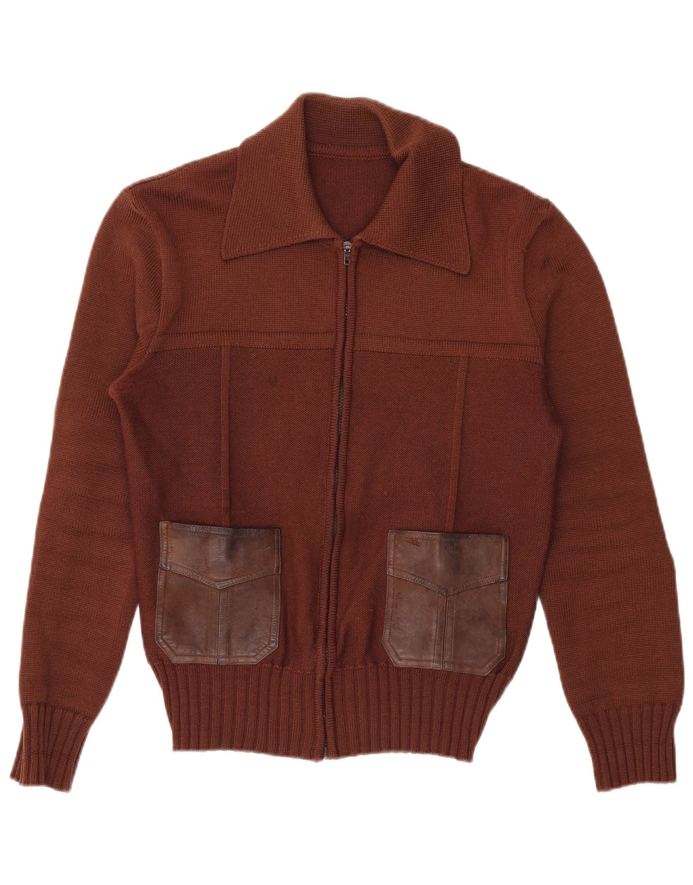 - AI Description: This Rainbow mens cardigan sweater is crafted from pure new wool knit, offering a rich brown hue and a soft texture. It features a collared neckline and a full zip closure for versatile styling. Long sleeves end in ribbed cuffs, matching the ribbed hem. Two front pockets with a distinct texture add a retro touch. The regular fit ensures comfortable wear.