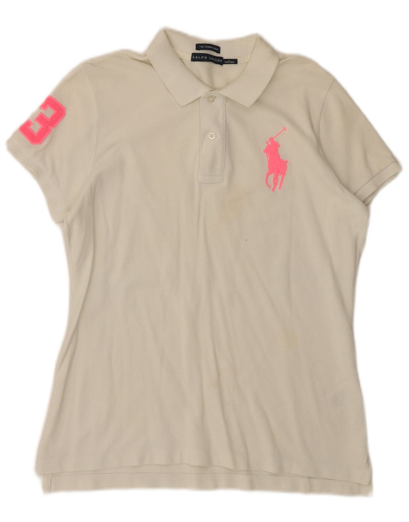 RALPH LAUREN Womens Graphic Skinny Polo Shirt UK 14 Large White Cotton