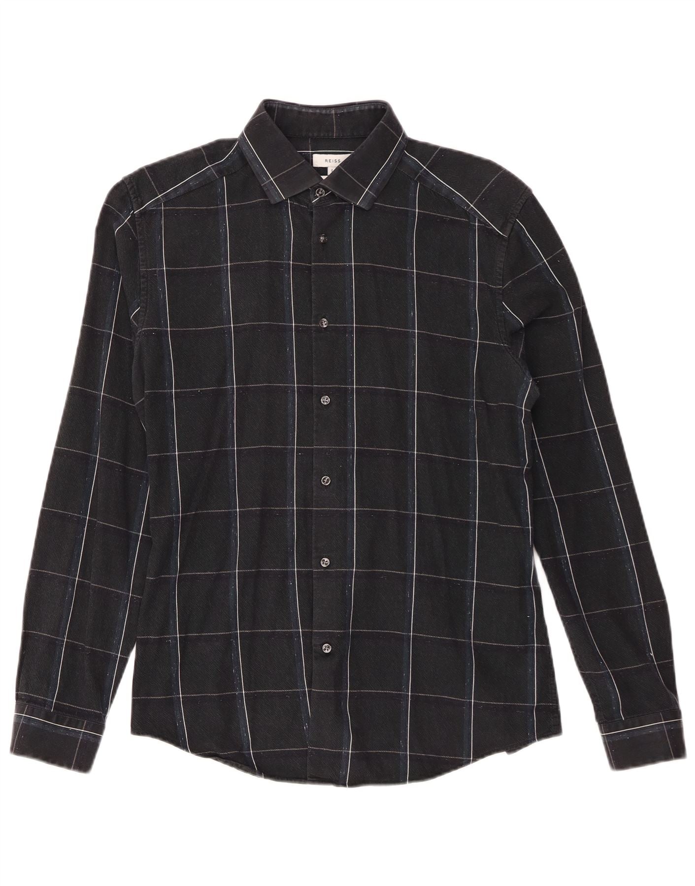 - AI Description: This Reiss mens shirt is crafted from a black woven cotton blend with a subtle stretch. It features a collared neckline and long cuffed sleeves. The design showcases a modern check pattern throughout. A button-up front and slim fit ensure a sharp, contemporary silhouette, perfect for a refined look.