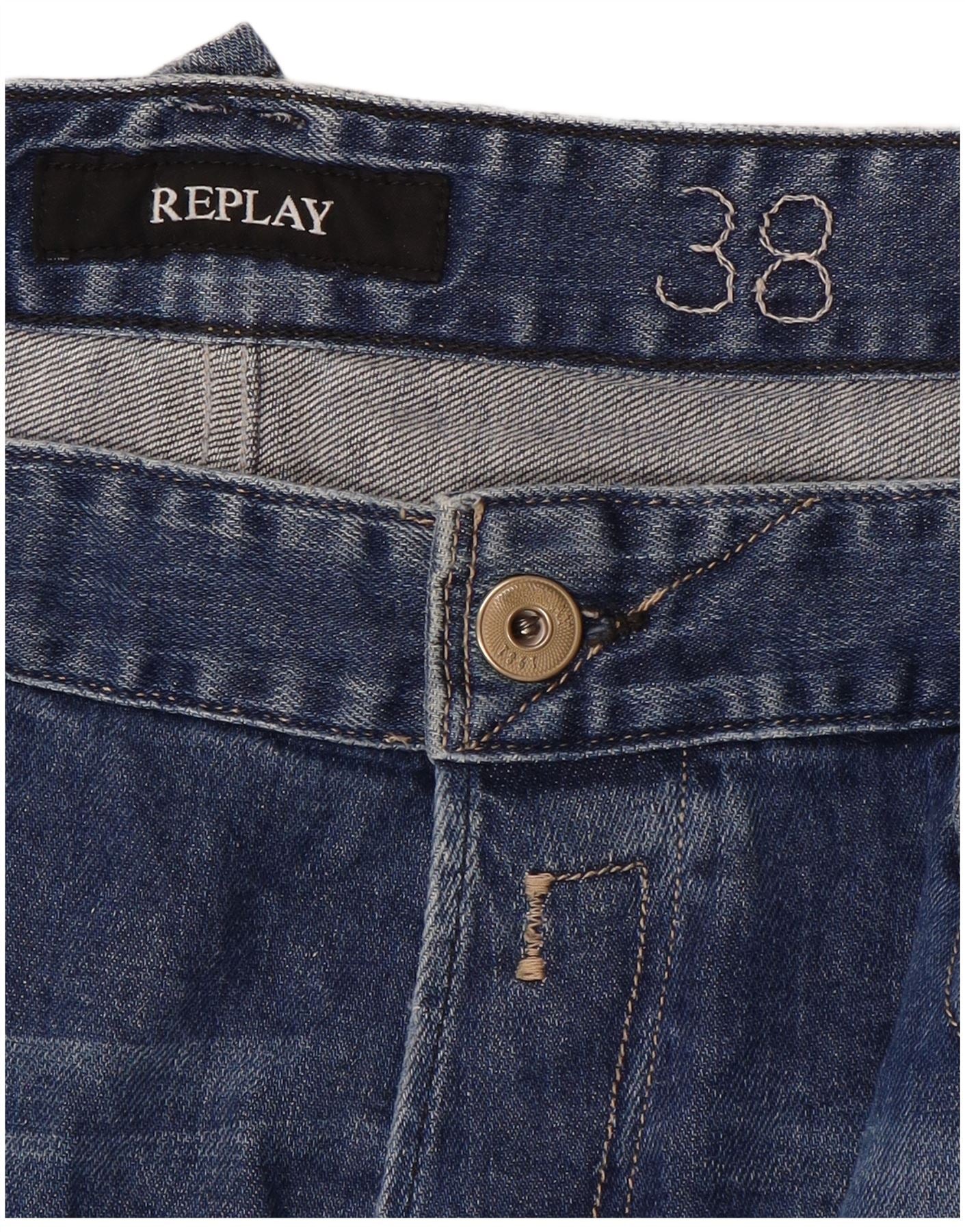 - AI Description: These Replay mens straight jeans are crafted from blue denim with a comfortable stretch. They feature a classic straight leg and a regular fit. The button closure provides a secure fastening. Distressed detailing adds a rugged, worn-in look. Practical pockets offer functionality. A subtle logo accent completes the classic style.