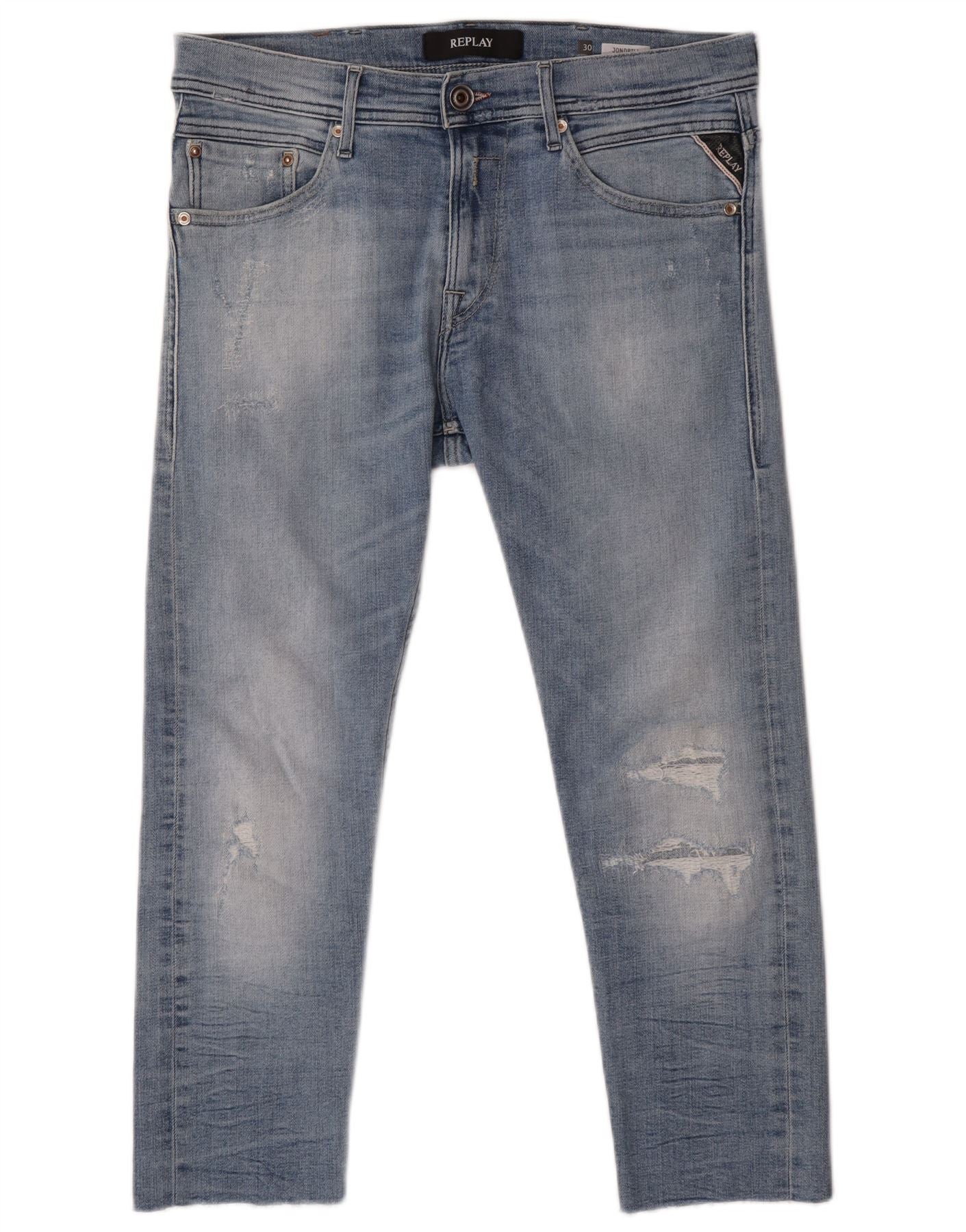 - AI Description: These Replay womens cropped jeans are crafted from blue denim with a distressed finish. They feature a slim fit and a button closure. The cropped length and raw hem add a modern edge. Classic pockets and a subtle logo accent complete the design, offering a contemporary casual style.