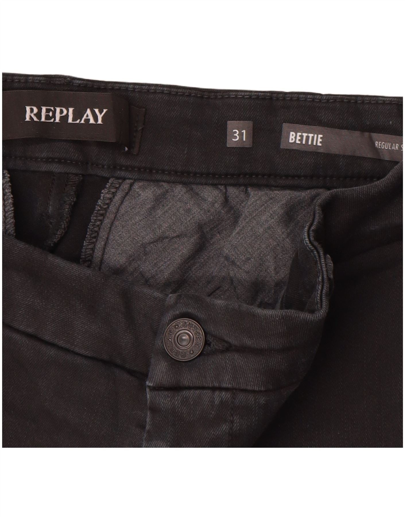 - AI Description: These Replay women's chino trousers are crafted from a woven fabric in a deep black hue. They feature a modern mid-rise waist and a button closure for a clean front. The regular fit offers comfortable wear. Practical pockets are included. The design is simple and unpatterned, focusing on a sleek, versatile aesthetic.