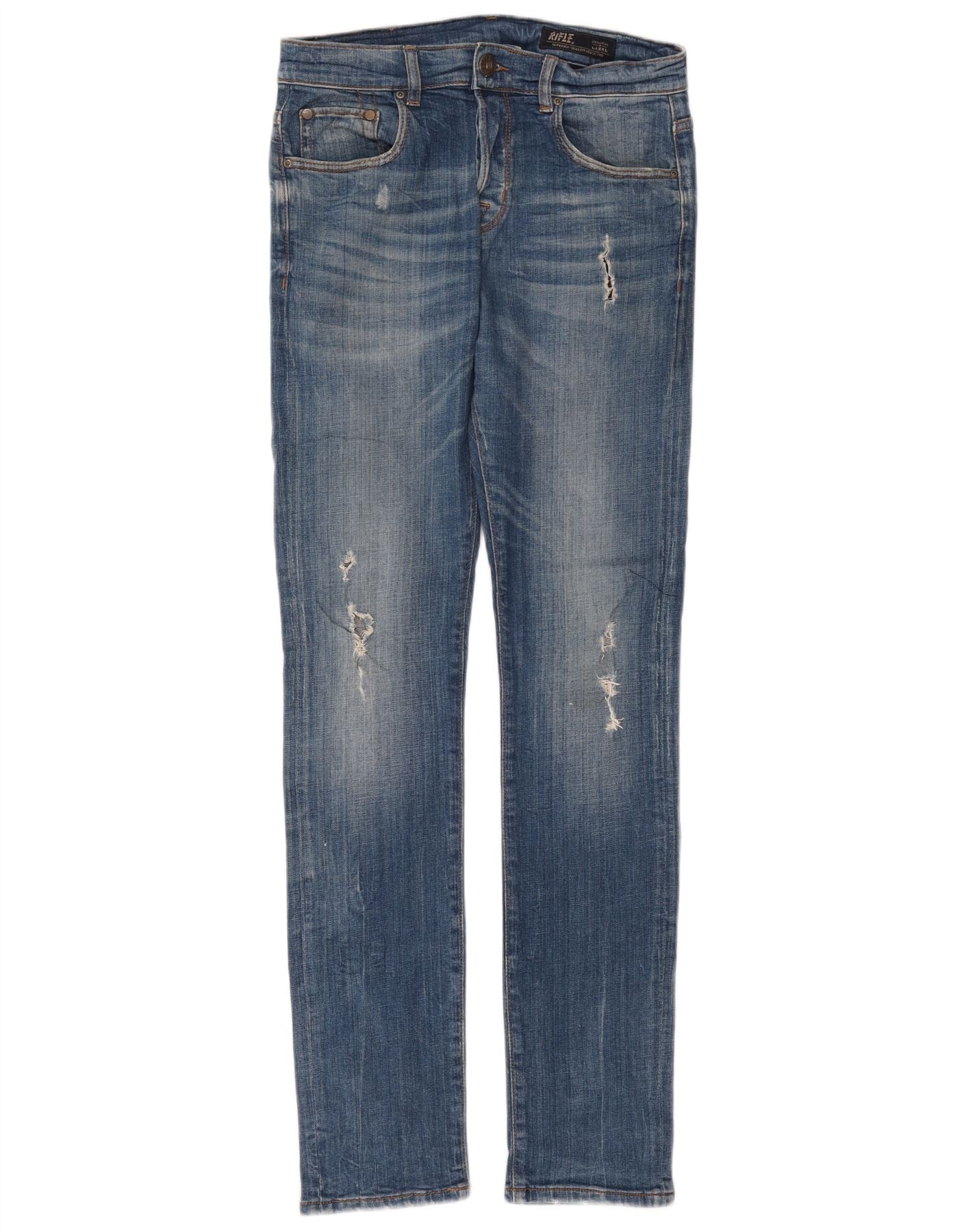 - AI Description: This Rifle womens slim jeans are crafted from blue denim with a comfortable stretch. The mid rise waist and button closure offer a secure fit. Slim tapered legs create a modern silhouette. Distressed detailing adds a contemporary edge. Pockets provide practicality. A subtle logo accent completes the design.