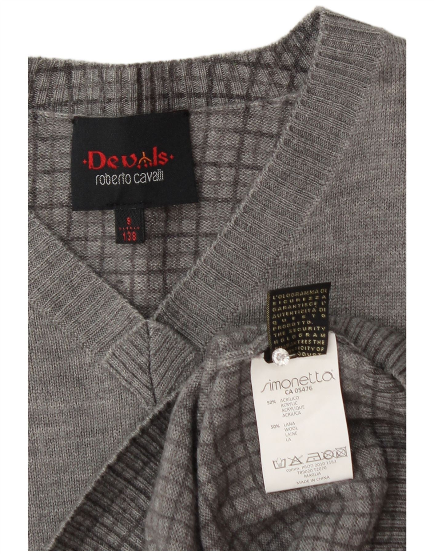 ROBERTO CAVALLI Boys V-Neck Jumper Sweater 9-10 Years Small Grey Acrylic