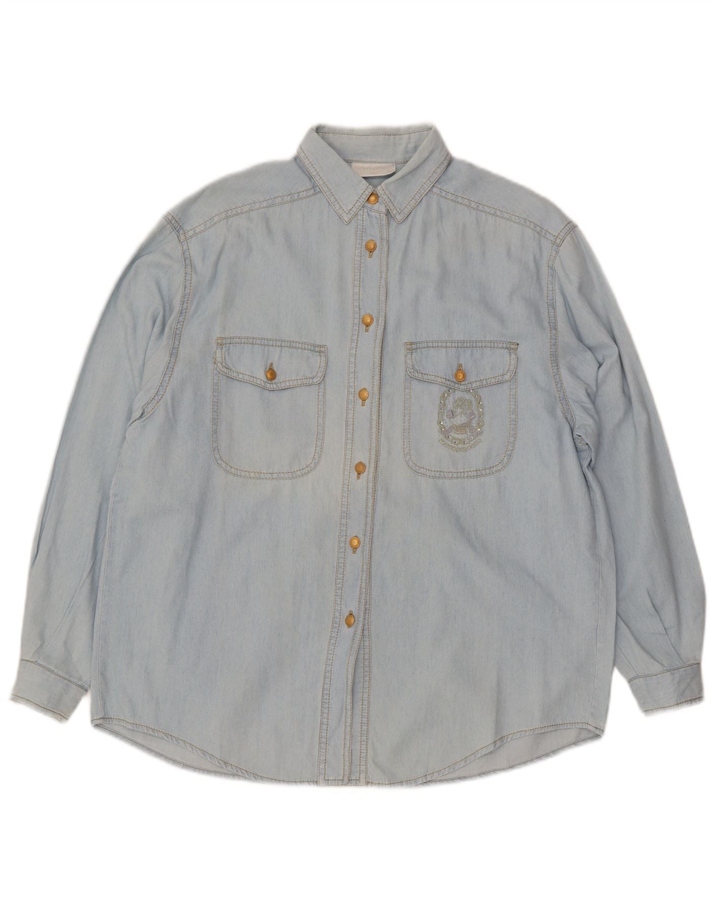 - AI Description: This Roccobarocco womens denim shirt is crafted from soft blue 100 percent cotton denim. It features a classic collared neckline and long sleeves with buttoned cuffs. The regular fit ensures comfortable wear. A full button up front and two chest pockets add functional detail. One pocket is subtly embroidered, enhancing its classic style. This versatile piece offers timeless appeal for everyday outfitting.