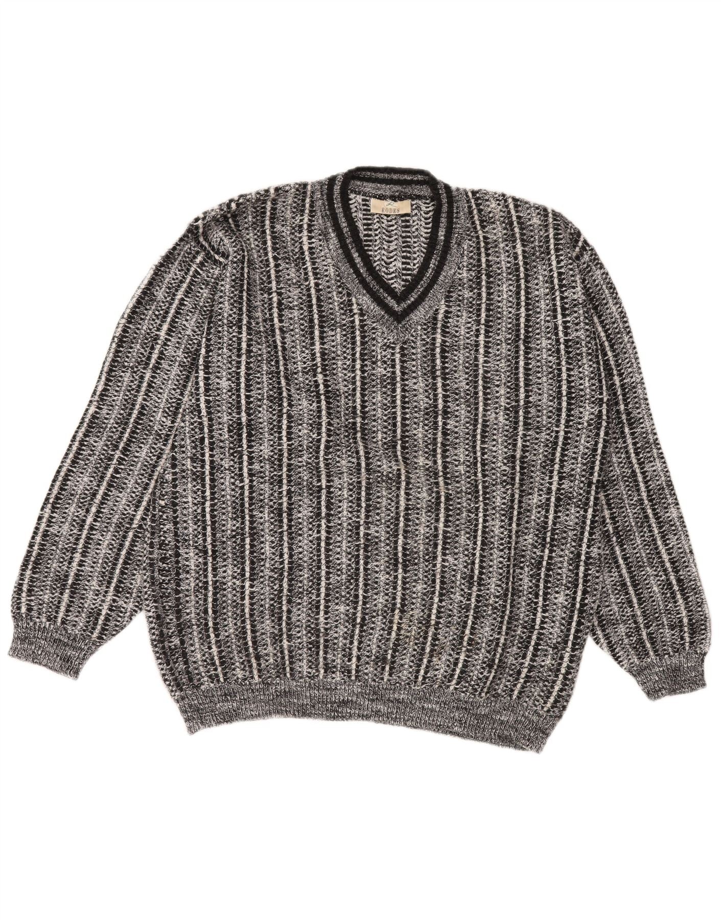 RODES Mens V-Neck Jumper Sweater Large Grey Striped Acrylic
