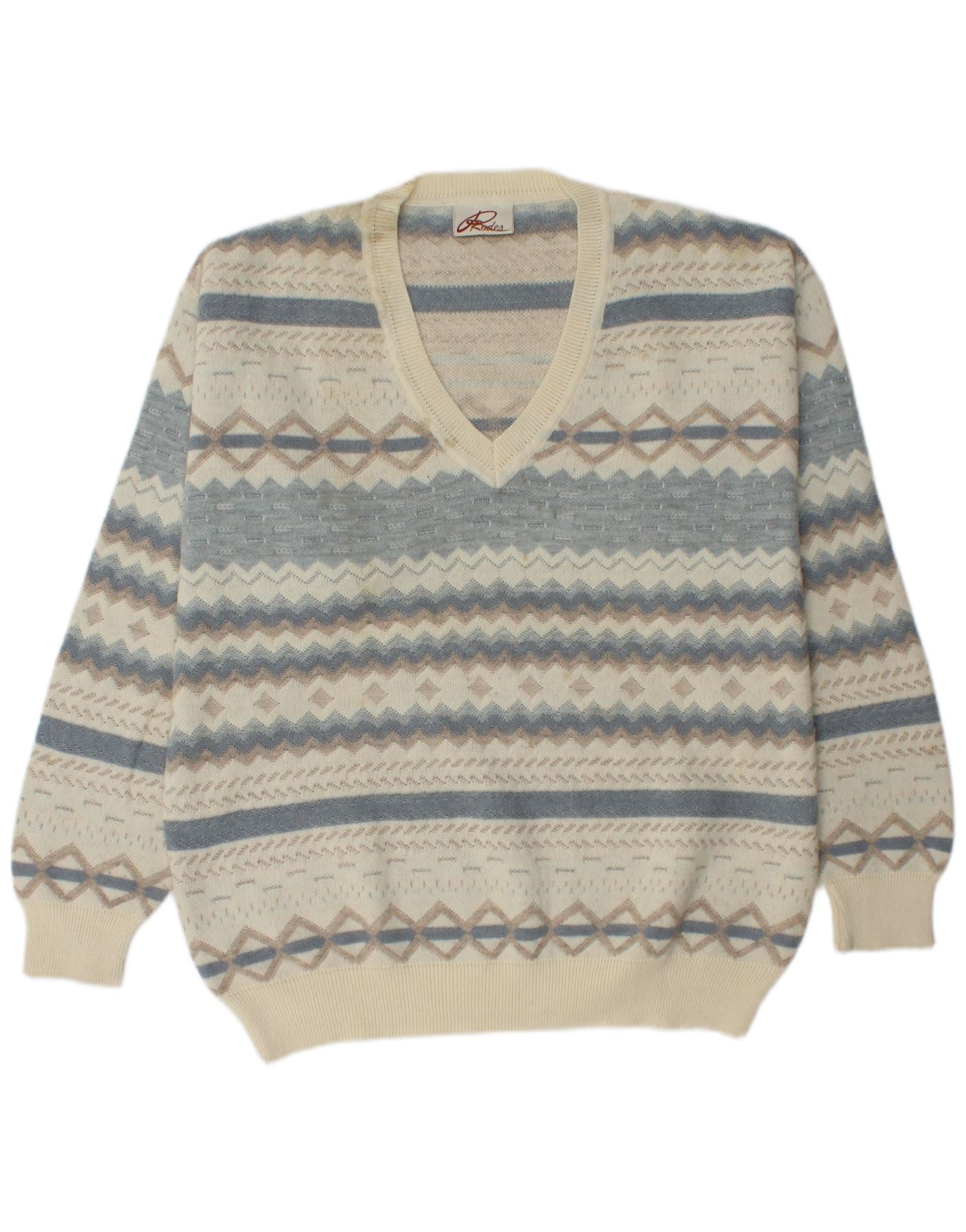RODES Mens V-Neck Jumper Sweater XL Off White Geometric Virgin Wool