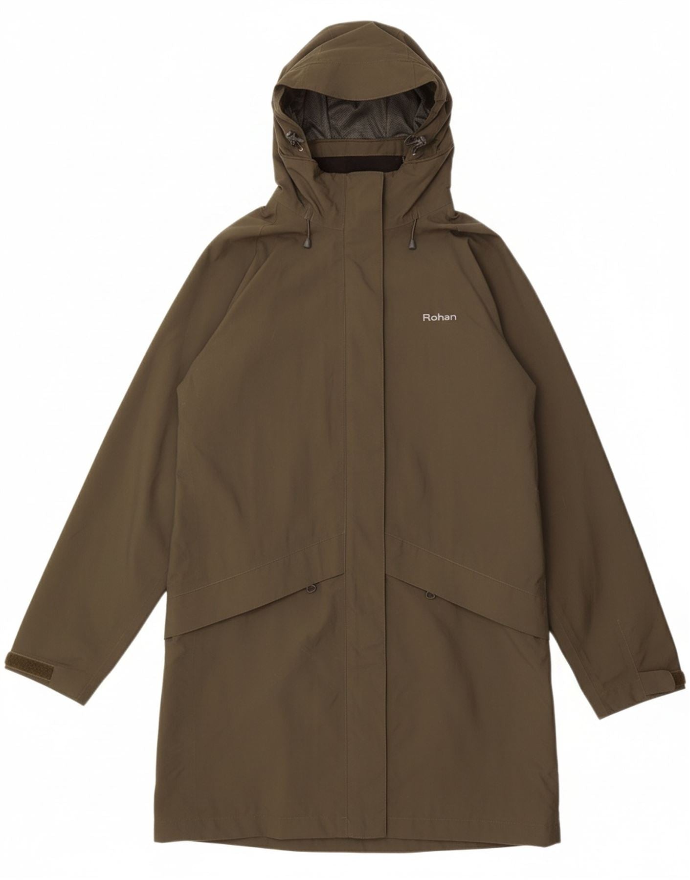 - AI Description: This Rohan womens waterproof jacket is crafted from durable khaki polyester, featuring a breathable PU hydrophilic membrane. Its full zip closure and high neck offer excellent protection. A fixed hood and long sleeves provide complete coverage. This regular fit jacket includes practical pockets, perfect for outdoor activities.
