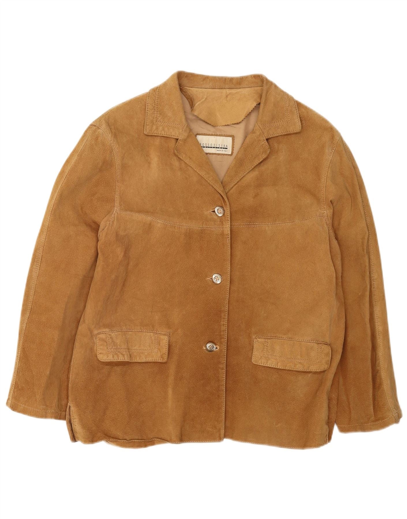 - AI Description: This Rossodisera womens suede jacket is crafted from luxurious brown suede, offering a soft, tactile finish. It features a classic collared neckline and long sleeves. The regular fit ensures comfortable wear. A three-button front closure and two practical front pockets add functional detail. The jacket is fully lined for added comfort and structure, embodying a timeless retro style.