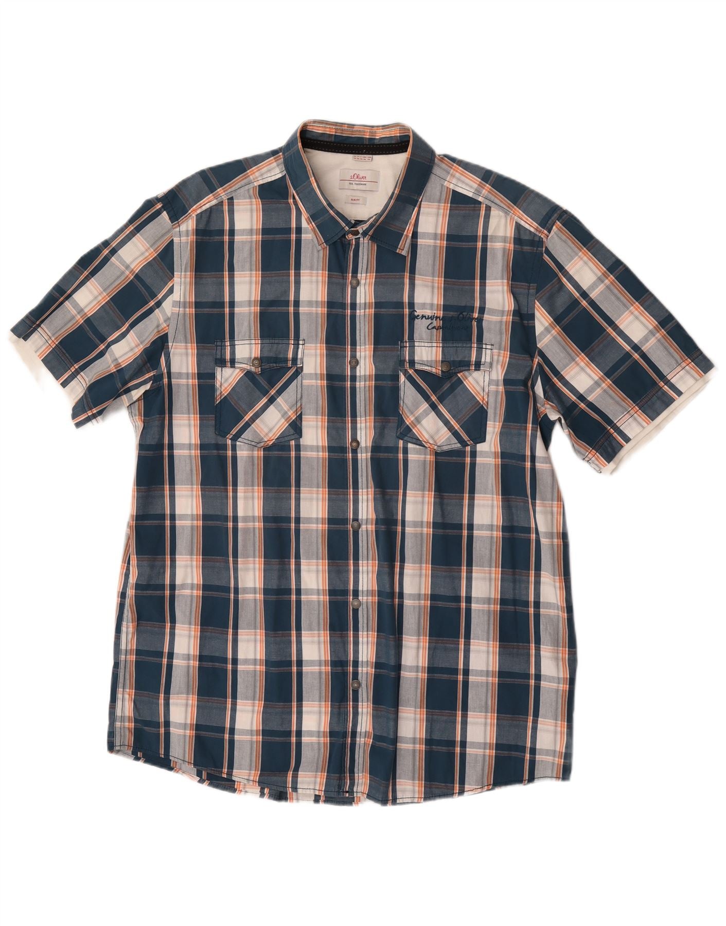 - AI Description: This S.Oliver mens shirt is crafted from 100 percent woven cotton. It features a vibrant blue, white, and orange check pattern. The collared neckline and button closure offer a classic look. Short sleeves and a slim fit provide a modern, tailored silhouette. Two chest pockets add practical detail. This shirt is perfect for smart casual occasions.