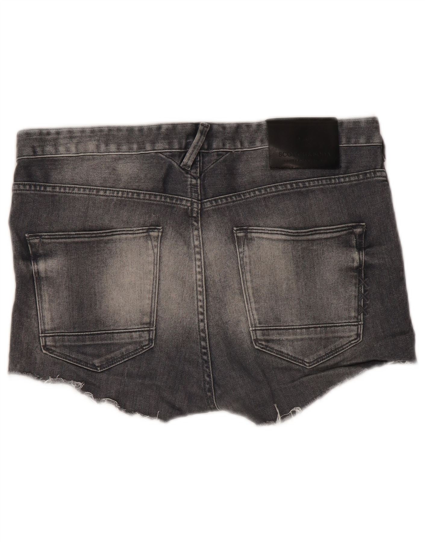 - AI Description: These Scotch & Soda womens denim shorts are crafted from 100 percent cotton denim. They feature a distressed black finish, giving a worn-in texture. The regular fit offers comfortable wear. A zip fly and button closure secure the waist. They include practical pockets. The distressed detailing adds a casual, edgy look. The raw hemline further enhances this relaxed style.