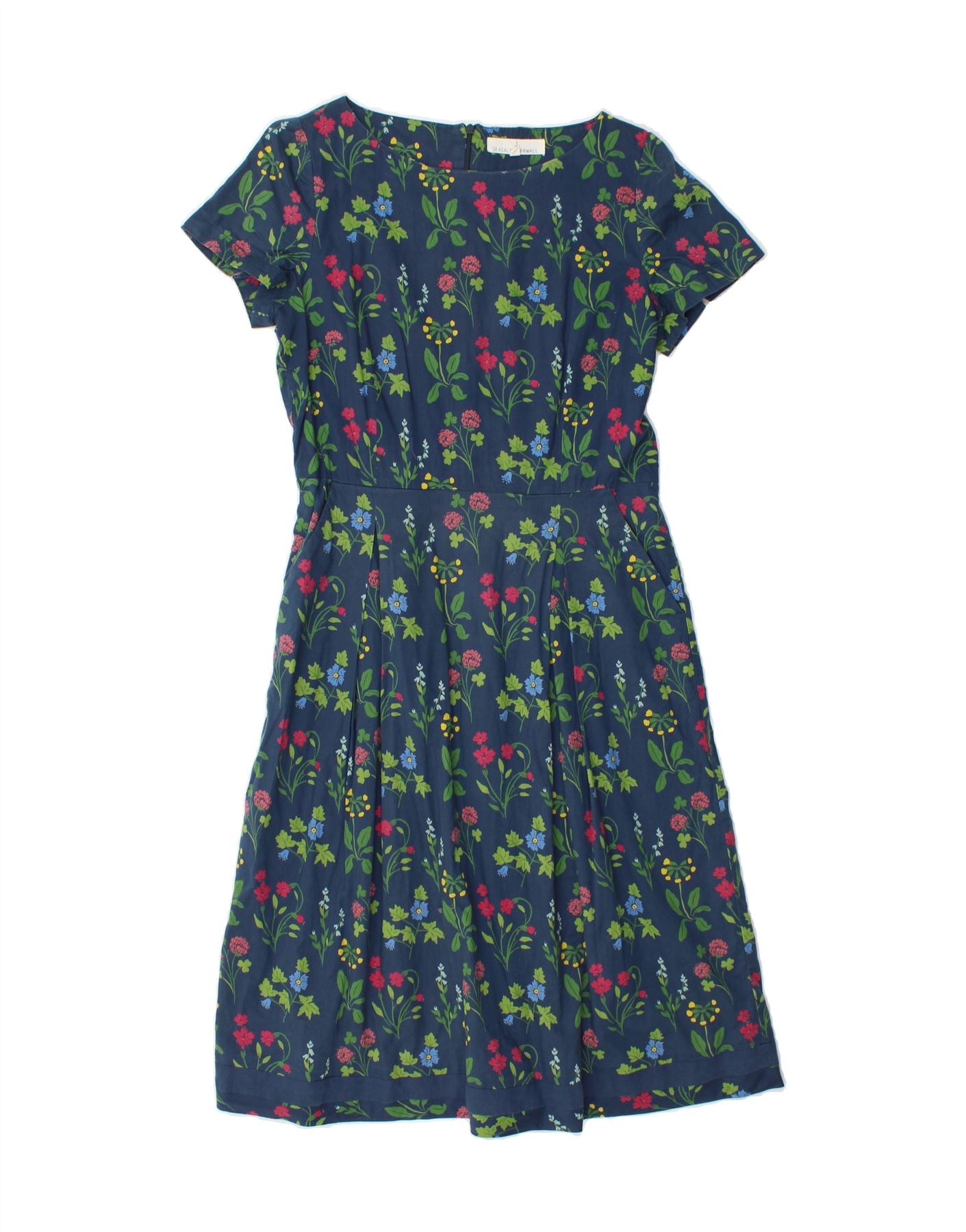 - AI Description: This pre-owned Seasalt Cornwall dress is in excellent condition, size 10. The blue, floral dress features a round neck, short sleeves and a regular fit. The woven fabric and zip closure ensure a quality feel. There is minor loose stitching on the hem and minor discoloration on the collar. A stylish flower design with a ruffle feature adds a touch of charm. Perfect for any occasion.