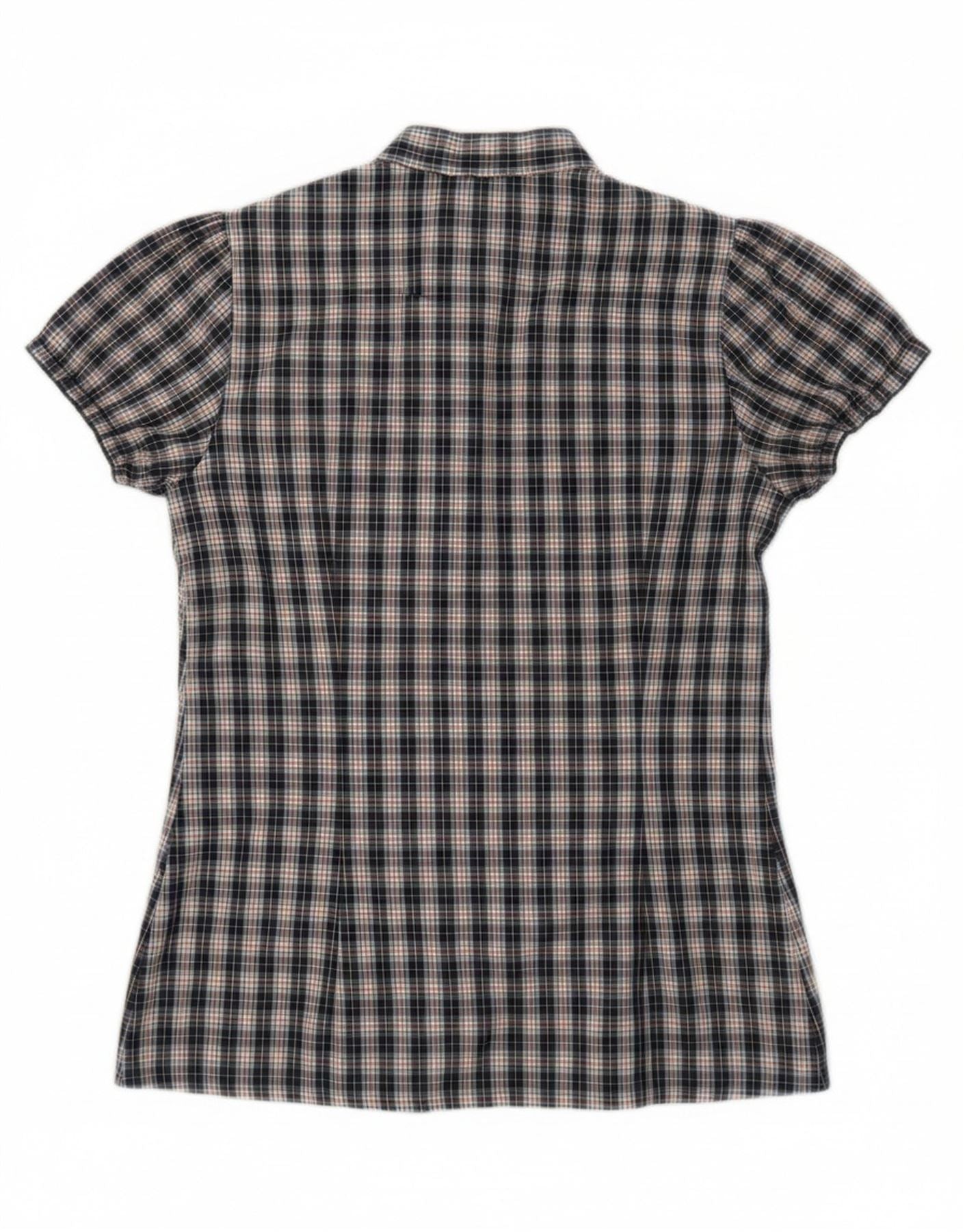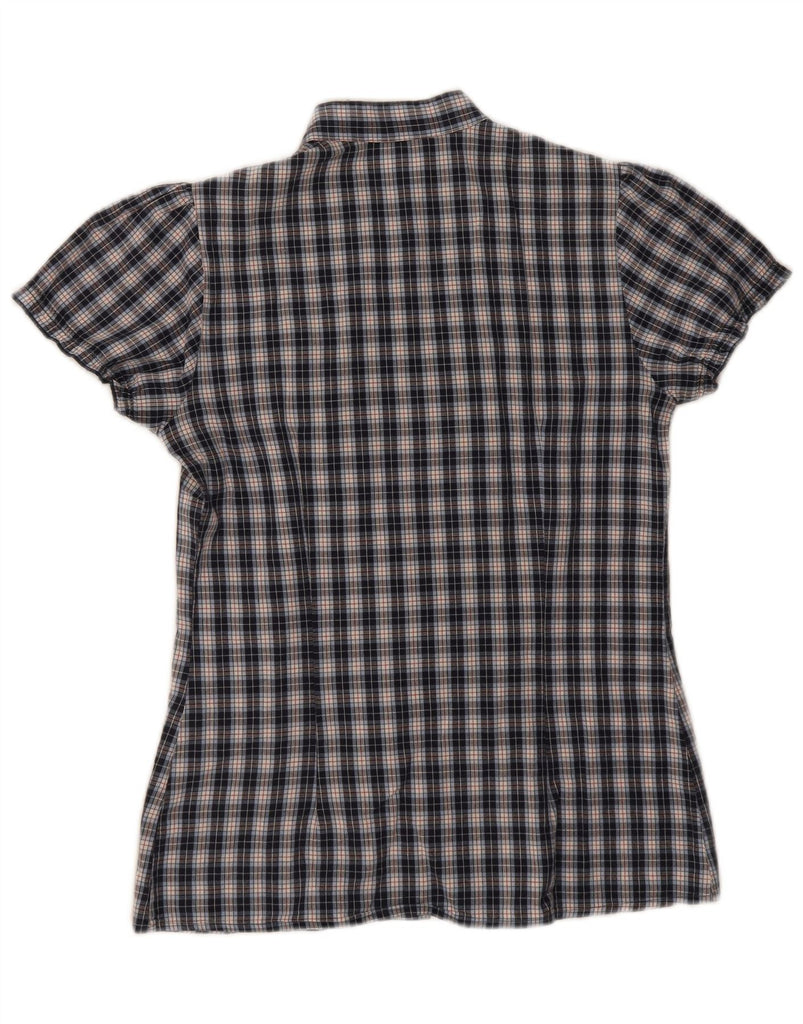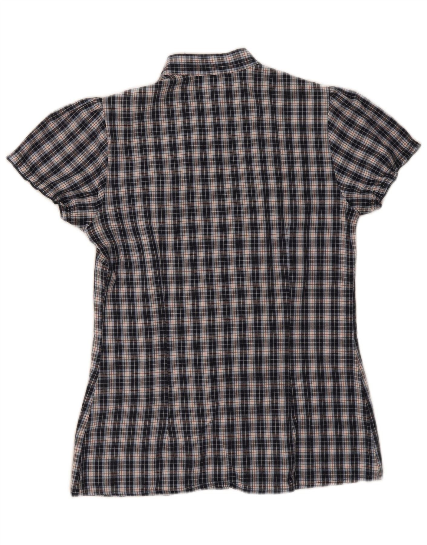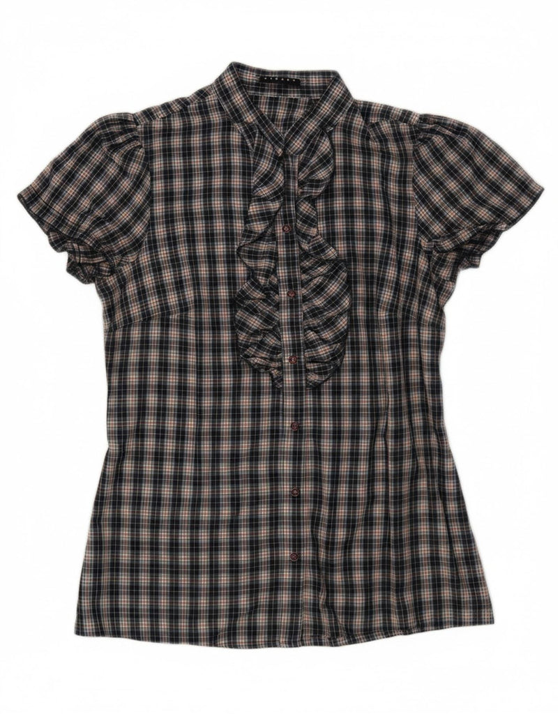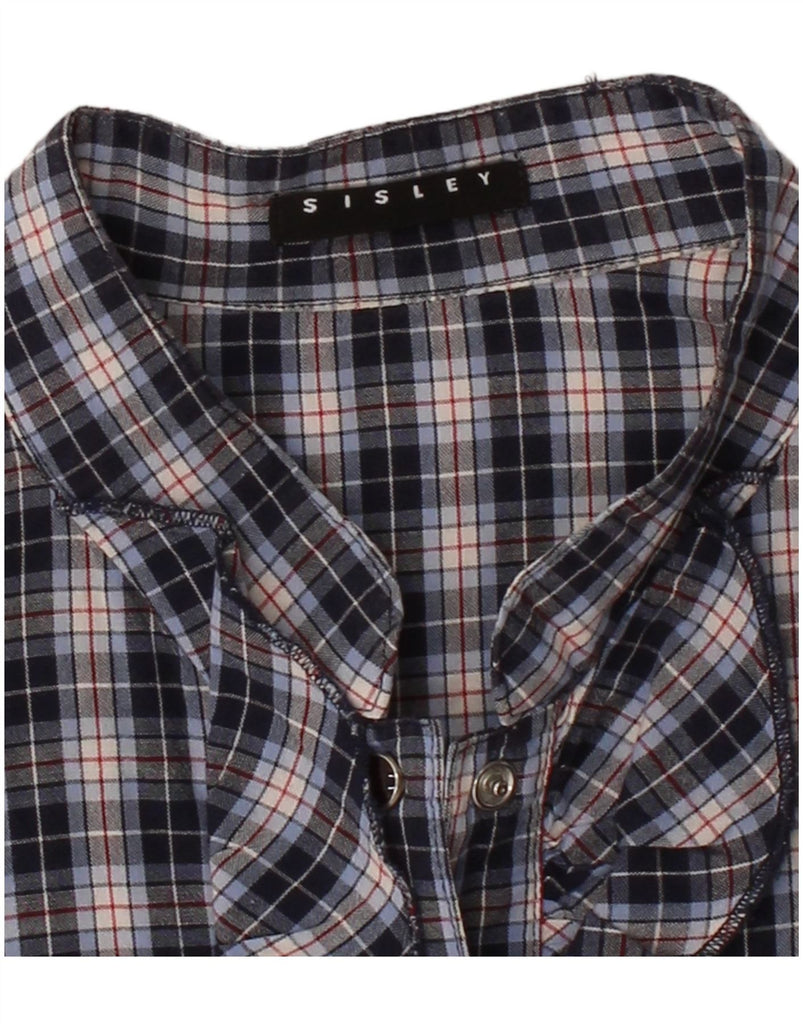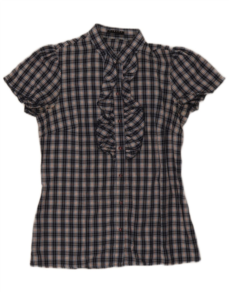 SISLEY Womens Ruffle Front Short Sleeve Shirt UK 12 Medium Navy Blue Check