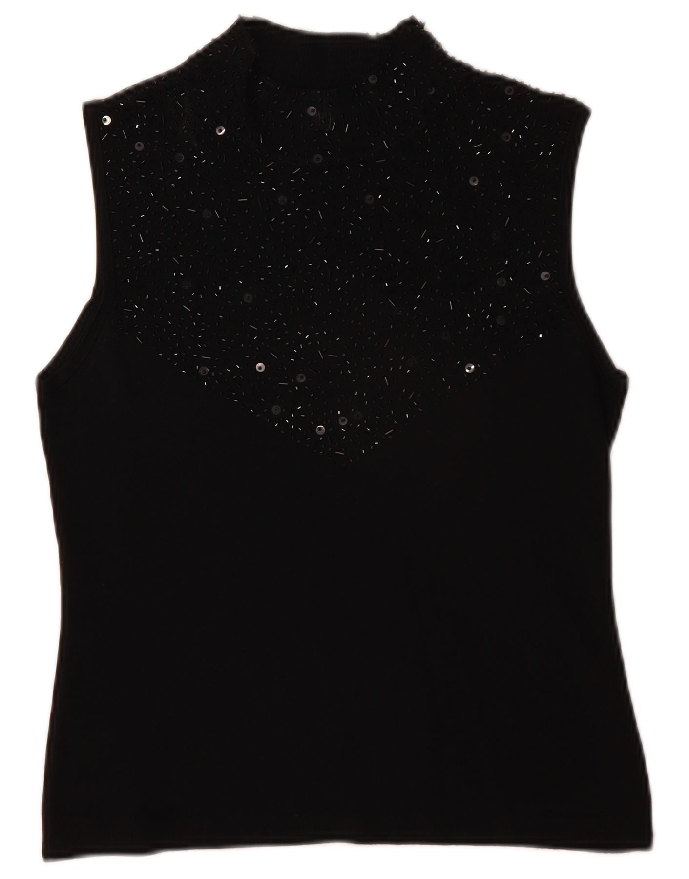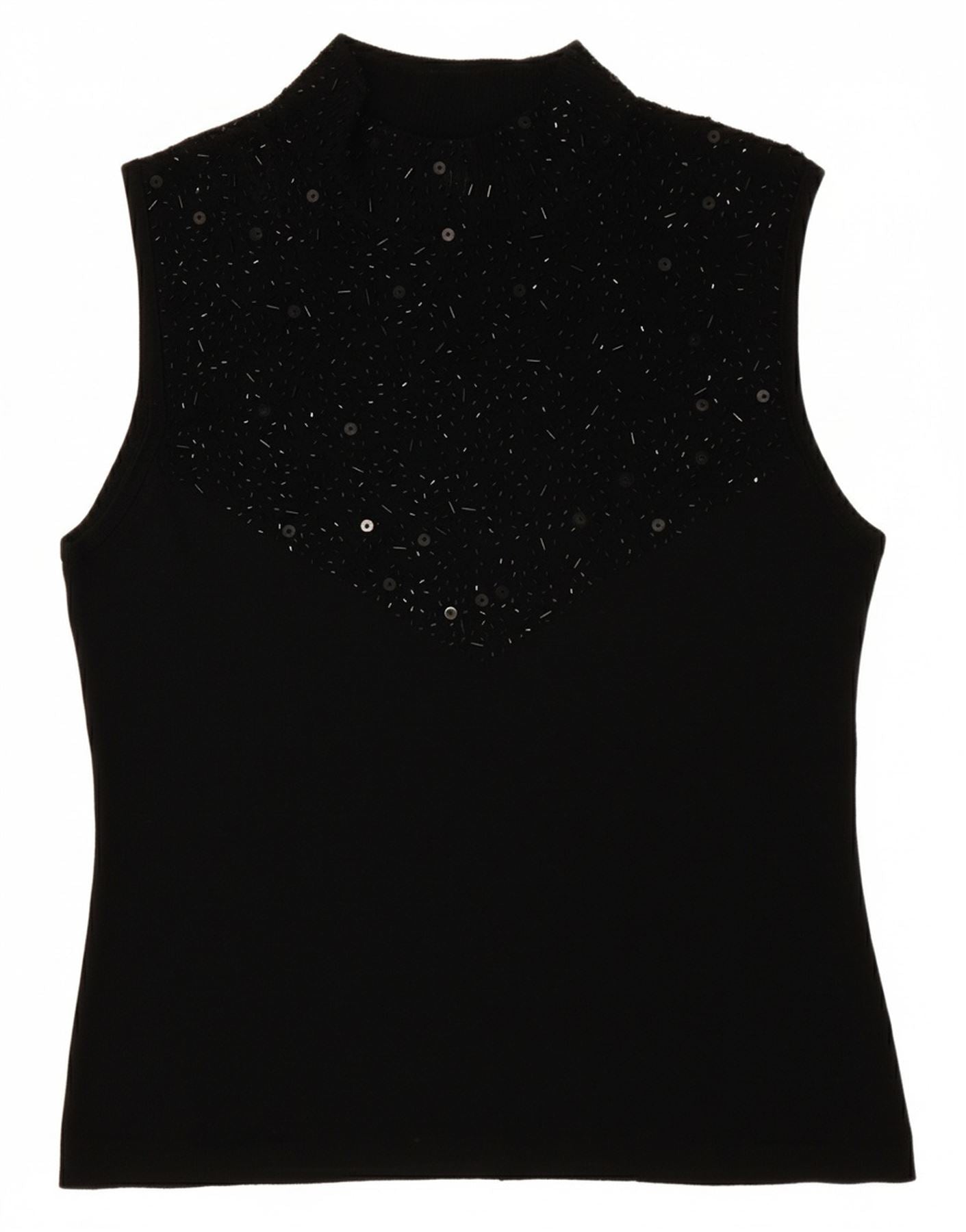 - AI Description: This Sky Designs womens Vest Top is crafted from a soft rayon blend, offering a smooth, comfortable feel. It features a sophisticated mock neck and a sleeveless design. The pullover style ensures a clean, streamlined look. A regular fit provides comfortable wear. An abstract pattern subtly enhances the black fabric. Delicate beaded accents add a touch of elegant embellishment.