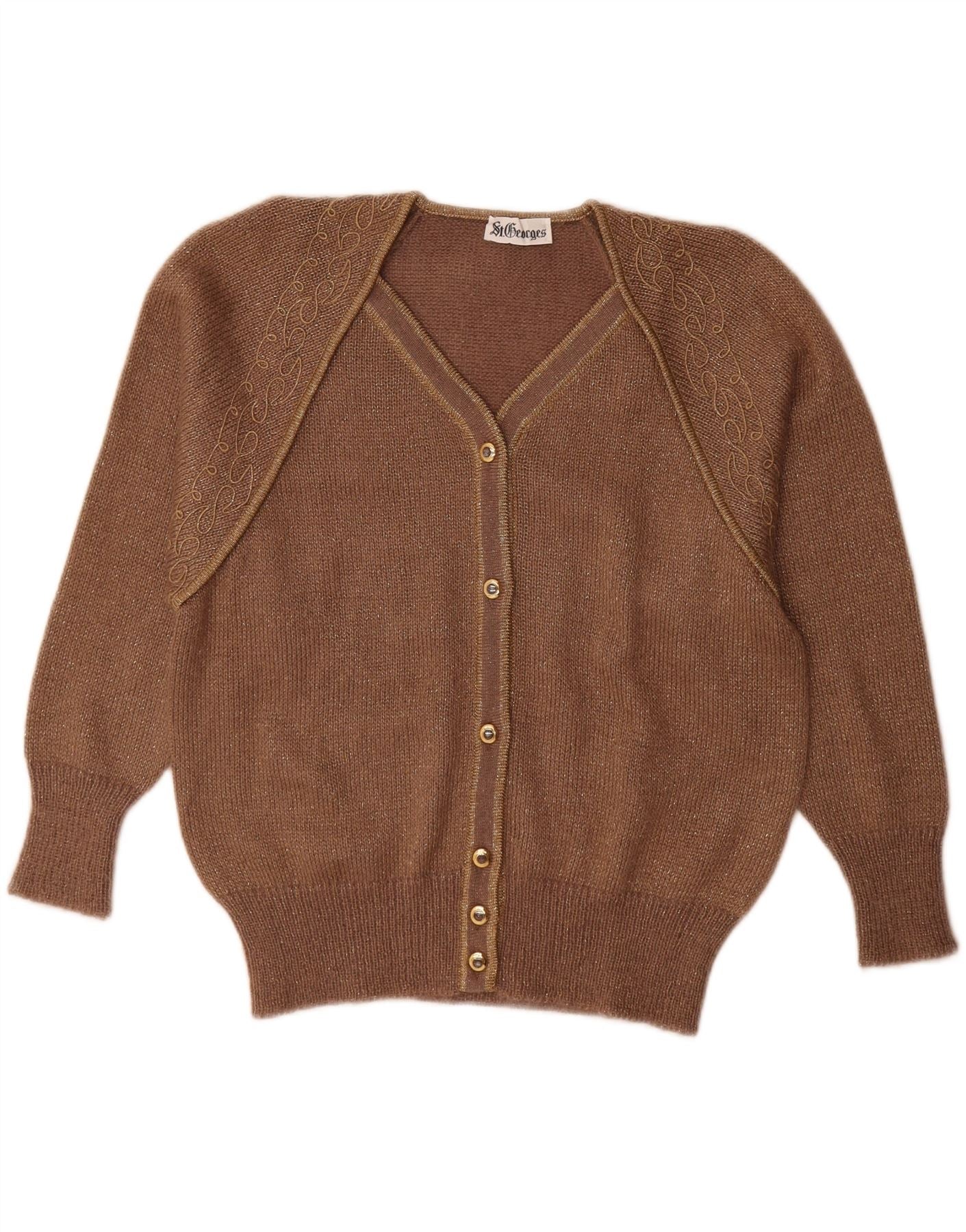 - AI Description: This St Georges women's cardigan sweater is crafted from a luxurious mohair blend knit, offering a soft, fuzzy texture in a rich brown. A subtle golden thread is woven throughout, adding a delicate shimmer. It features a classic V-neckline and a full button-up front with golden-toned buttons. Long sleeves finish with comfortable cuffed wrists. The regular fit ensures ease of wear. Delicate woven detailing adorns the shoulders, enhancing its retro charm.