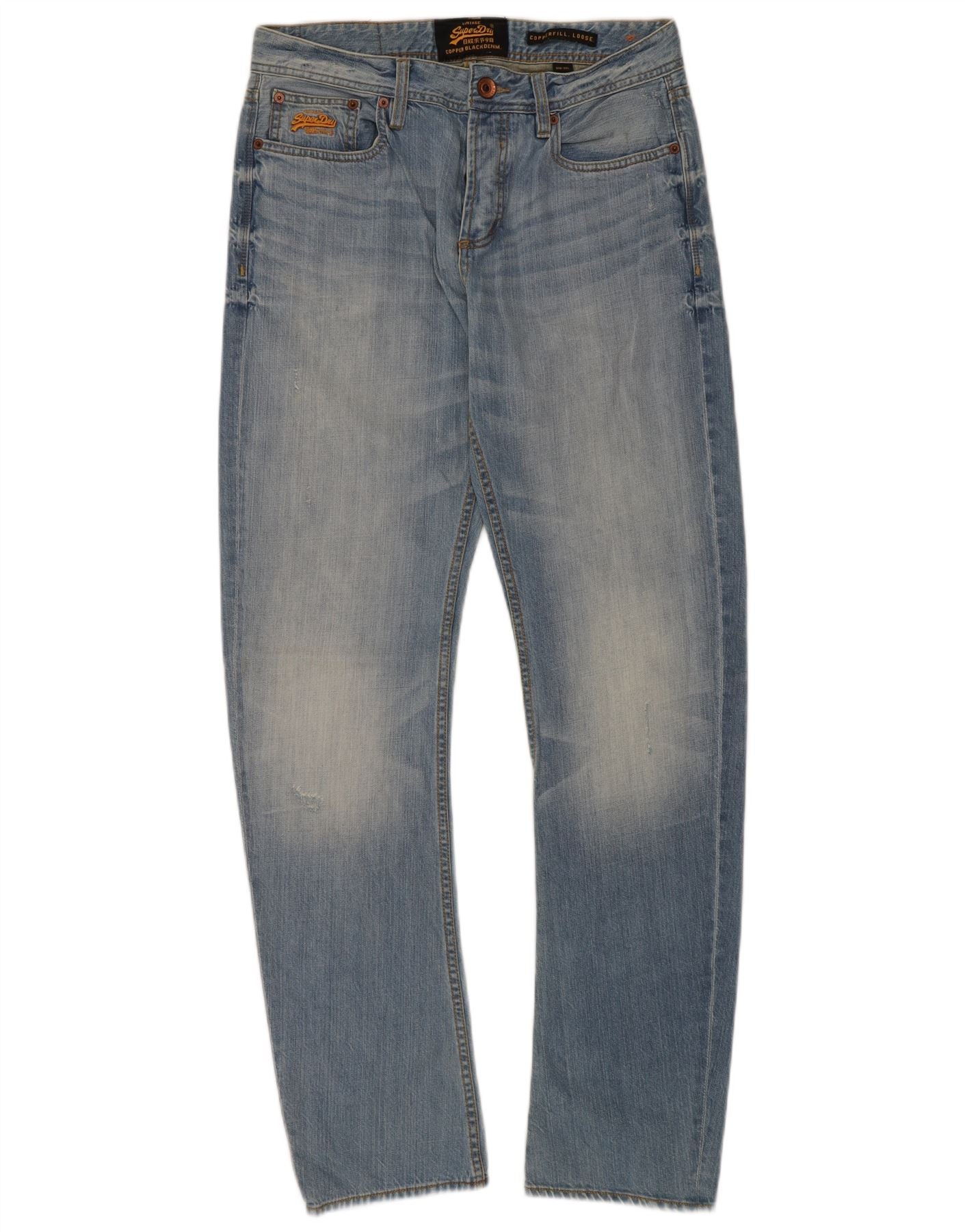 - AI Description: These Superdry men's loose jeans are crafted from 100 percent cotton denim. They feature a light blue wash with a distressed finish. The relaxed, loose fit offers comfort and a retro style. A zip closure secures the front. Classic five pocket styling provides practicality. Subtle logo accents are visible on the waistband and rear pocket. The overall design is clean and straightforward.