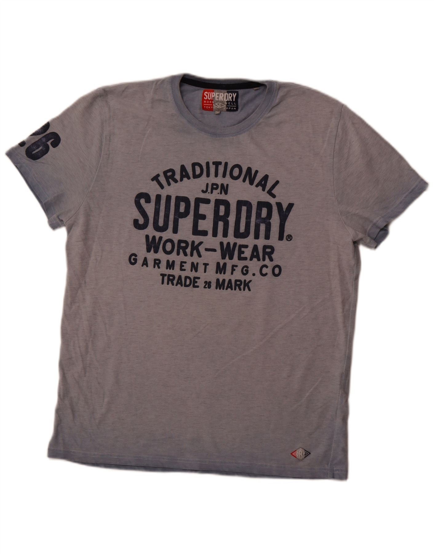 - AI Description: This Superdry mens graphic T-shirt is crafted from a soft blue blended fabric, a comfortable mix of cotton and polyester. It features a classic round neckline and short sleeves for everyday wear. The front displays a bold Superdry graphic print, adding a distinctive brand accent. Its regular fit ensures a comfortable and versatile silhouette, perfect for casual styling.