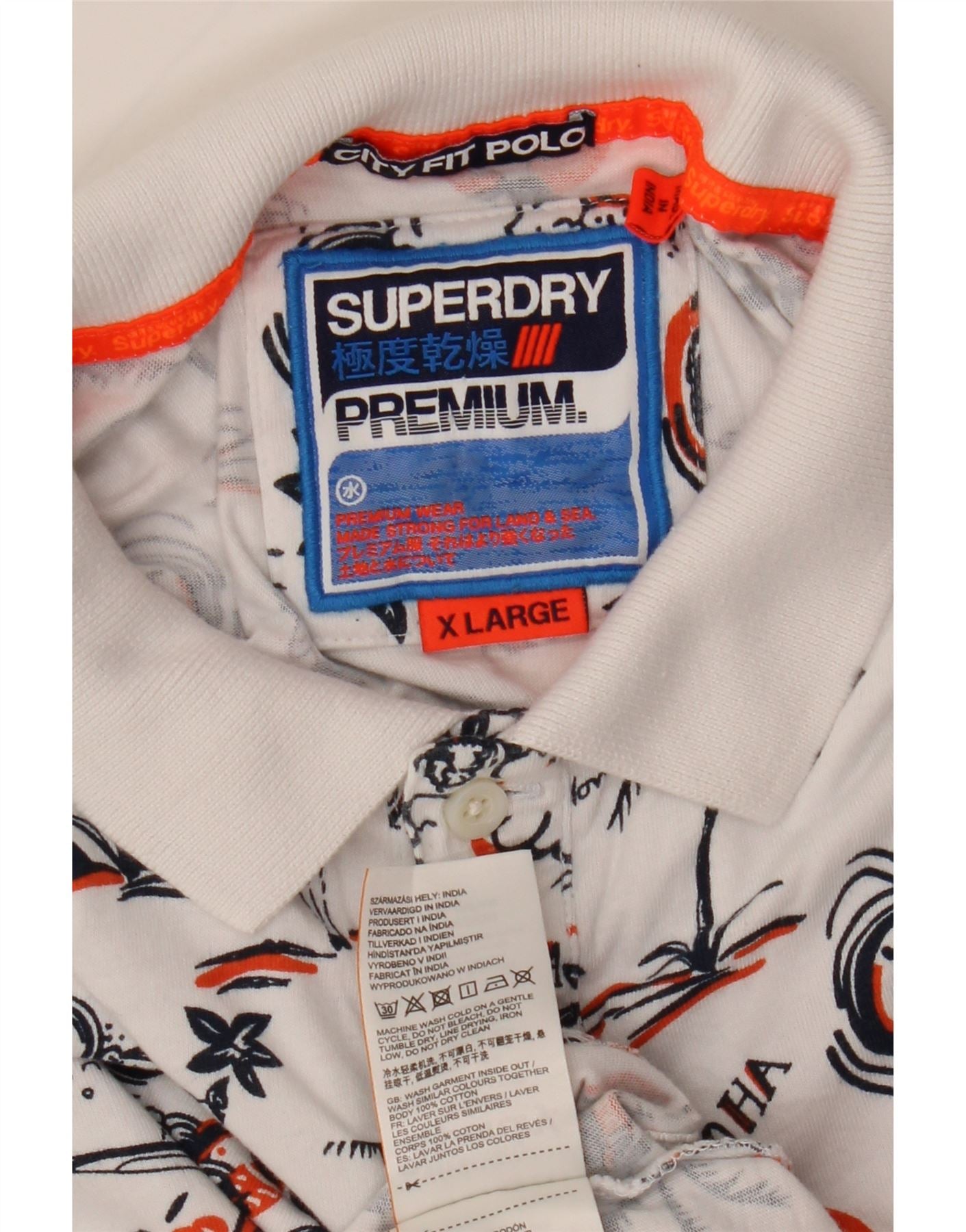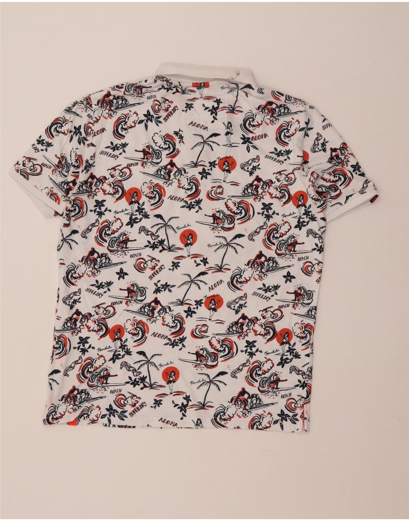 - AI Description: This Superdry mens Polo Shirt is crafted from soft white 100 percent cotton jersey. It features a vibrant tropical pattern with palm trees and surf inspired motifs. The collared neckline and button placket offer a classic, smart casual look. Short sleeves and a regular fit ensure comfortable wear. A subtle Superdry logo adds a signature brand detail.