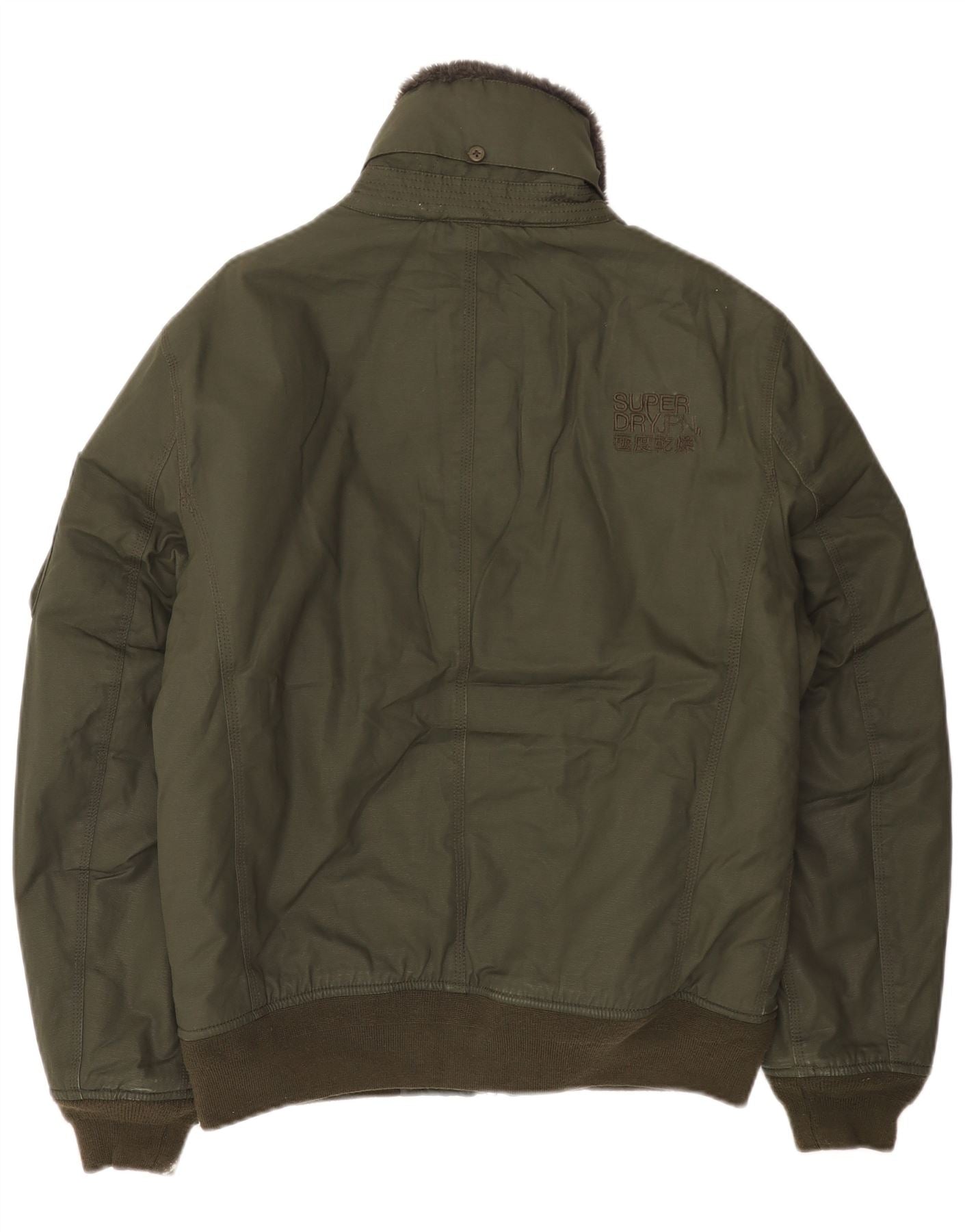 - AI Description: This Superdry mens bomber jacket is crafted from durable khaki polyester woven fabric. It features a classic collared neckline with a soft faux fur trim for added warmth. The full zip closure and long sleeves offer practical coverage. Ribbed cuffs and hem define the regular fit. Multiple pockets provide functional detail, completing this military-inspired design.