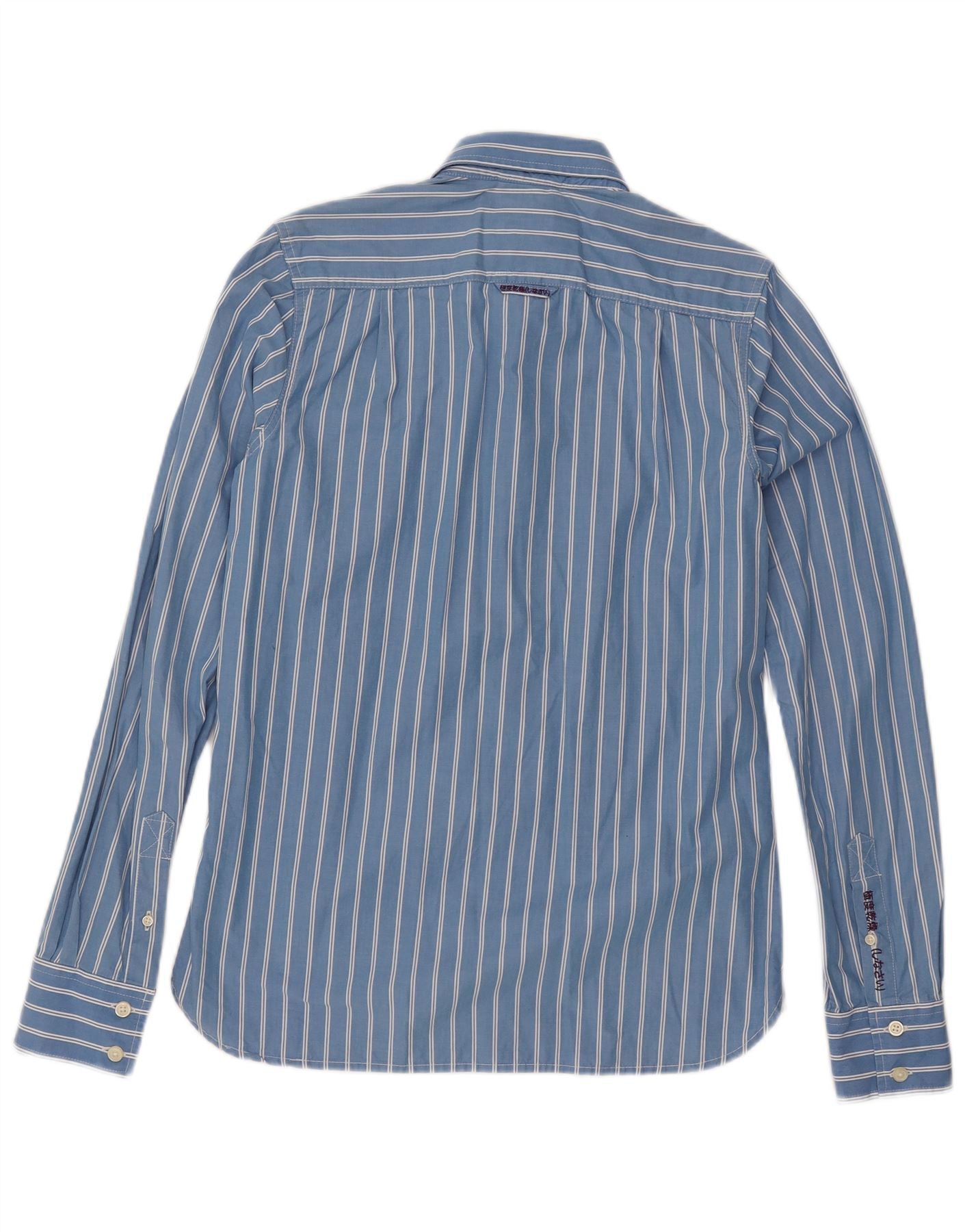 - AI Description: This Superdry mens shirt is crafted from 100 percent cotton woven fabric. It features a classic blue and white striped pattern. The collared neckline and full button-up front offer a timeless look. Long sleeves finish with buttoned cuffs. A regular fit ensures comfortable wear. It includes a chest pocket and an embroidered logo detail. This shirt combines classic style with everyday practicality.