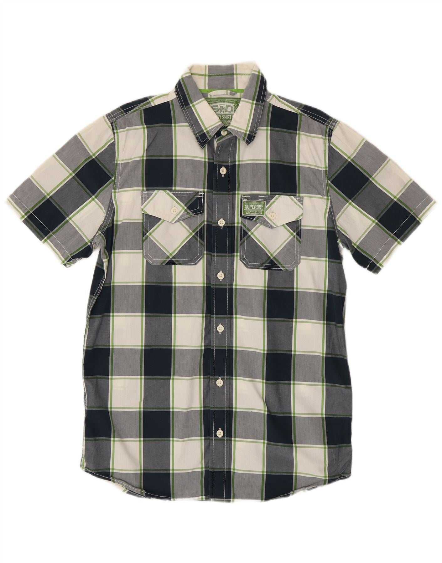 - AI Description: This Superdry mens shirt is crafted from 100 percent cotton, featuring a crisp woven texture. It showcases a distinctive check pattern in navy blue, white, and green. The collared neckline and button-up front offer a classic, smart appeal. Short sleeves and a regular fit ensure comfortable wear. Twin chest pockets with button closures add practical detail. This shirt combines traditional style with a fresh, modern aesthetic.