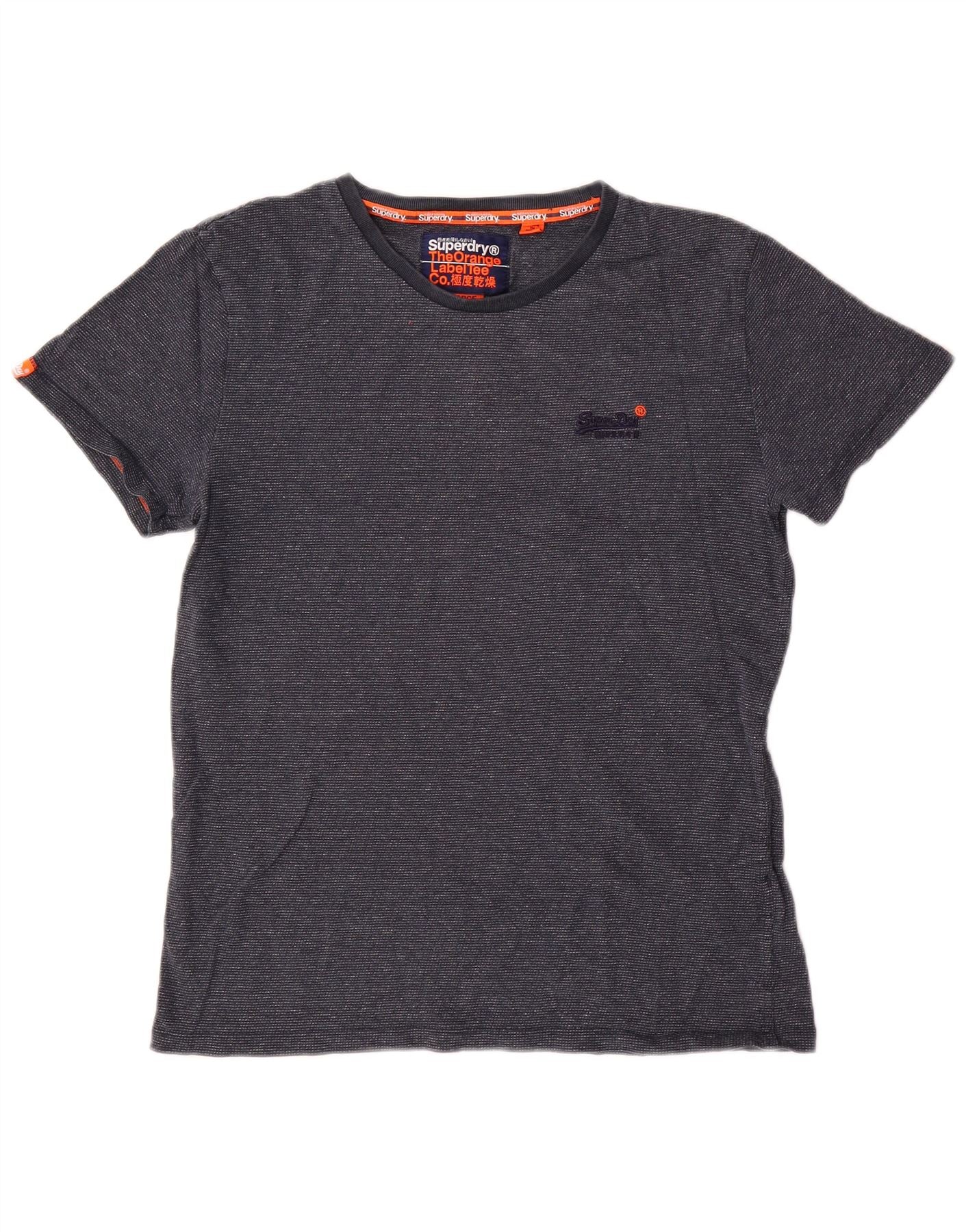 - AI Description: This Superdry mens Graphic T-Shirt Top is crafted from soft jersey fabric. It features a flecked black pattern, offering subtle texture. The classic round neck is accented with a distinctive orange trim. Short sleeves complete the design. A small logo is present on the chest, adding signature branding. Its regular fit ensures comfort and ease of movement. This lightweight pullover offers versatile, casual style.