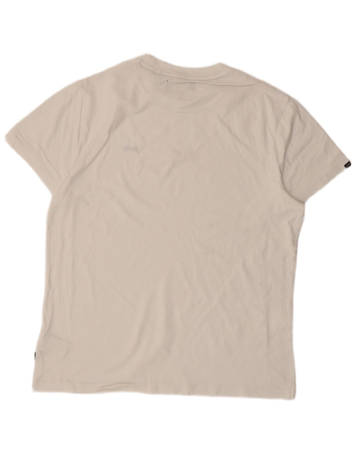 - AI Description: This Superdry mens graphic T-shirt is crafted from soft white organic cotton jersey. It features a classic round neck and short sleeves for everyday comfort. The regular fit ensures a relaxed silhouette. A subtle embroidered logo on the chest adds a signature touch. This pullover top is breathable and lightweight, perfect for casual wear.