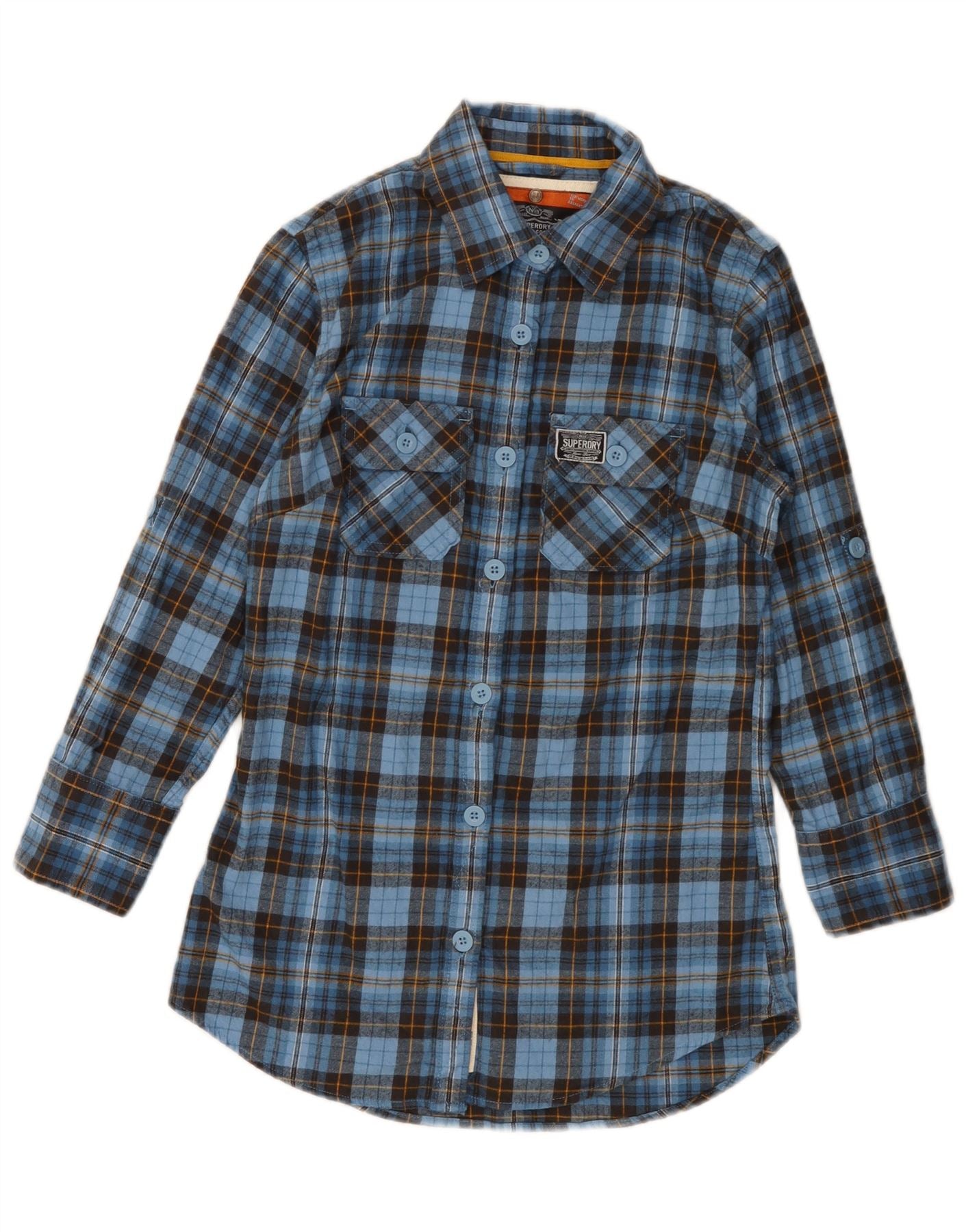 SUPERDRY Womens 3/4 Sleeve Flannel Shirt UK 10 Small Blue Check Cotton