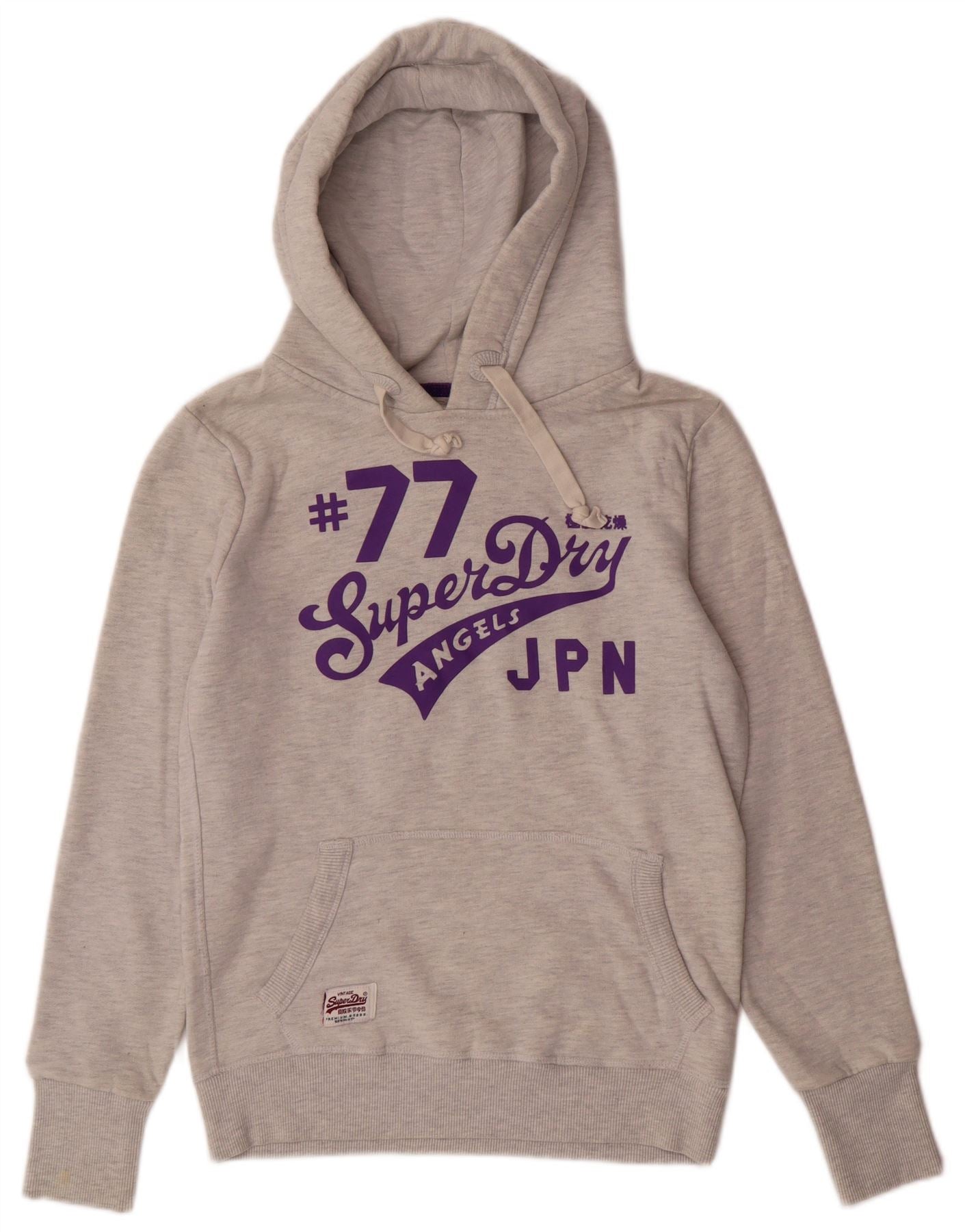 - AI Description: This Superdry womens hoodie jumper is crafted from a soft grey cotton polyester blend fleece. It features a classic pullover design with a comfortable hooded neckline and long sleeves. The front showcases a bold purple 77 SuperDry ANGELS JPN logo, while a large 77 graphic adorns the back. A practical kangaroo pocket adds functionality. The regular fit ensures everyday comfort and a retro style.