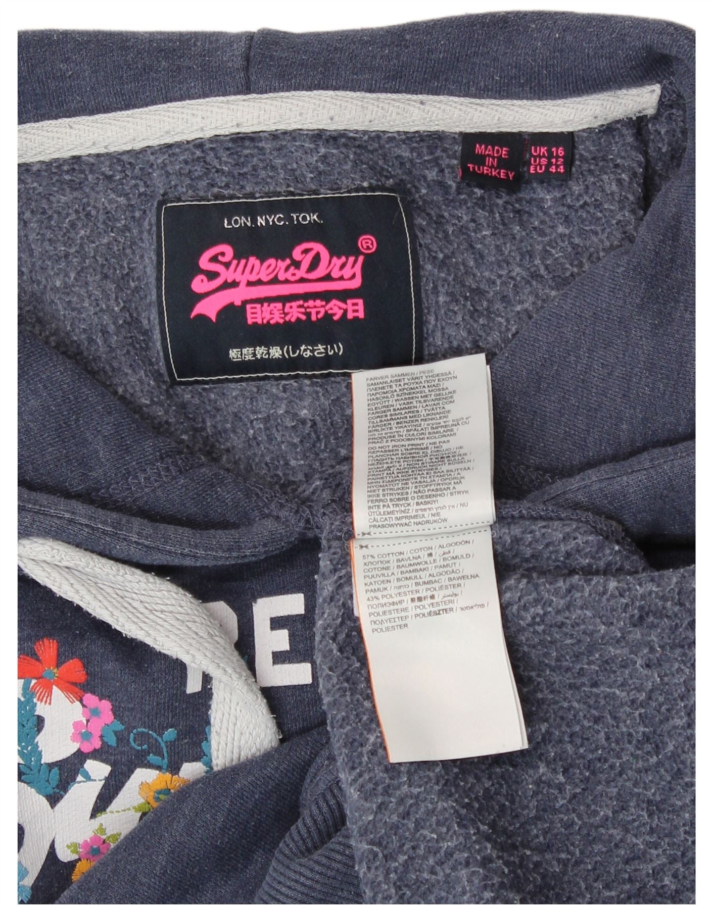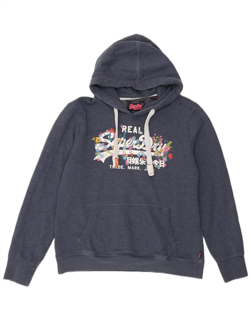 SUPERDRY Womens Graphic Hoodie Jumper UK 16 Large Navy Blue Floral Cotton