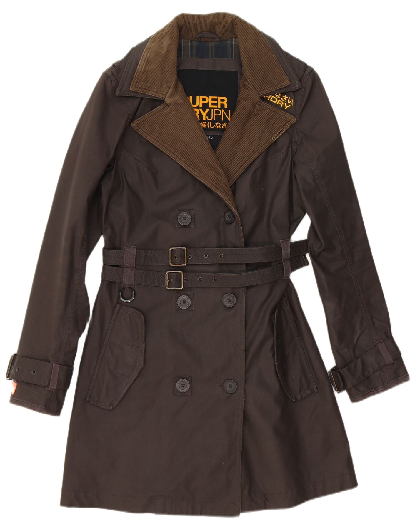 - AI Description: This Superdry womens trench coat is crafted from durable brown wax cotton, offering a water resistant finish. It features a classic double breasted design with button closure. A collared neckline and long sleeves provide traditional styling. The belted waist cinches for a flattering silhouette. Practical pockets add functionality. Buckle accents complete the timeless look.