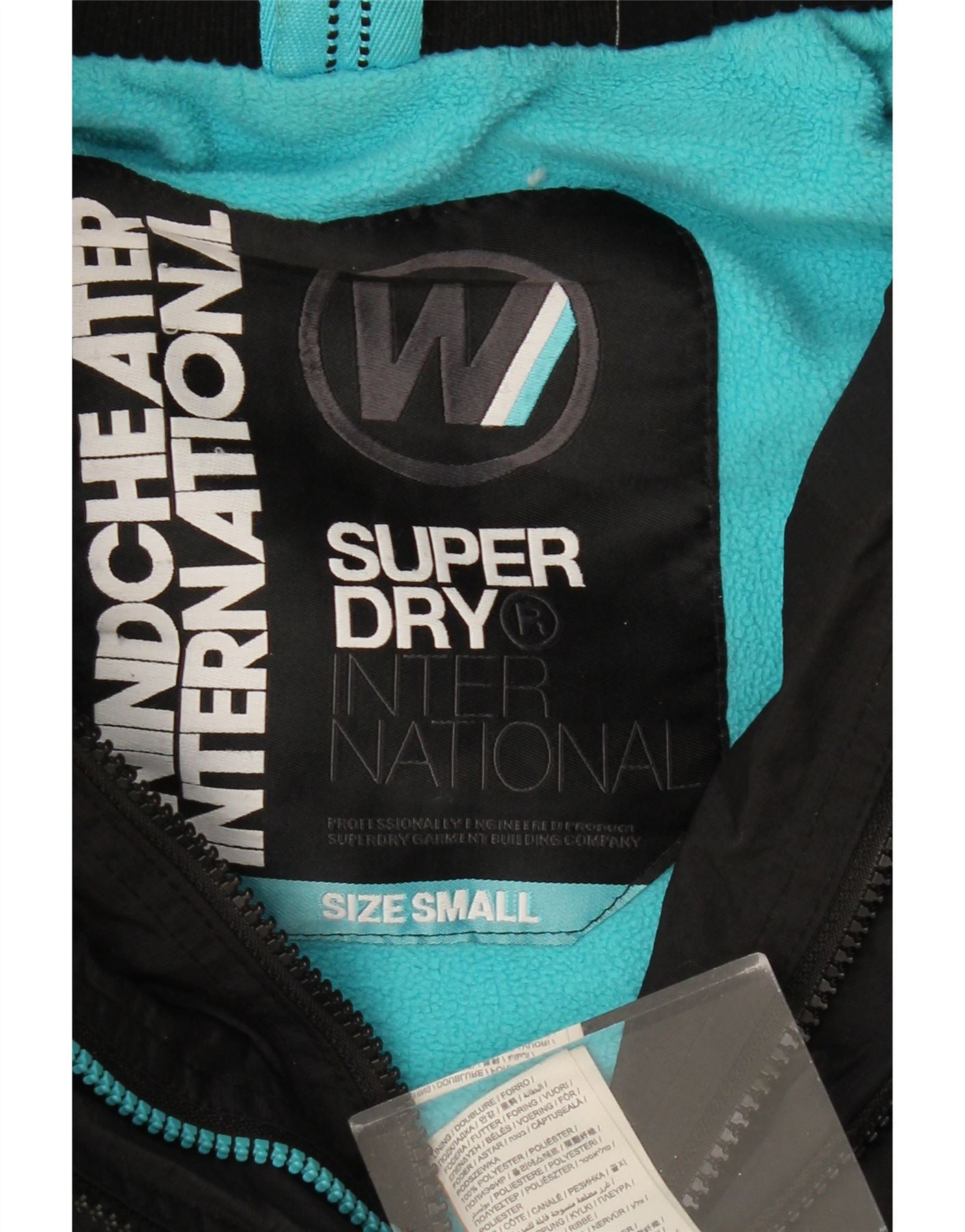 - AI Description: This Superdry womens Windbreaker Jacket is crafted from durable black woven polyester. It offers a smooth, waterproof finish. The hooded design features a high neck and long sleeves. A full zip closure ensures secure wear. Zipped pockets provide practical storage. The interior boasts a contrasting blue lining. Subtle Superdry branding accents the design. Its regular fit provides comfortable movement. This windproof jacket is ideal for outdoor activities.