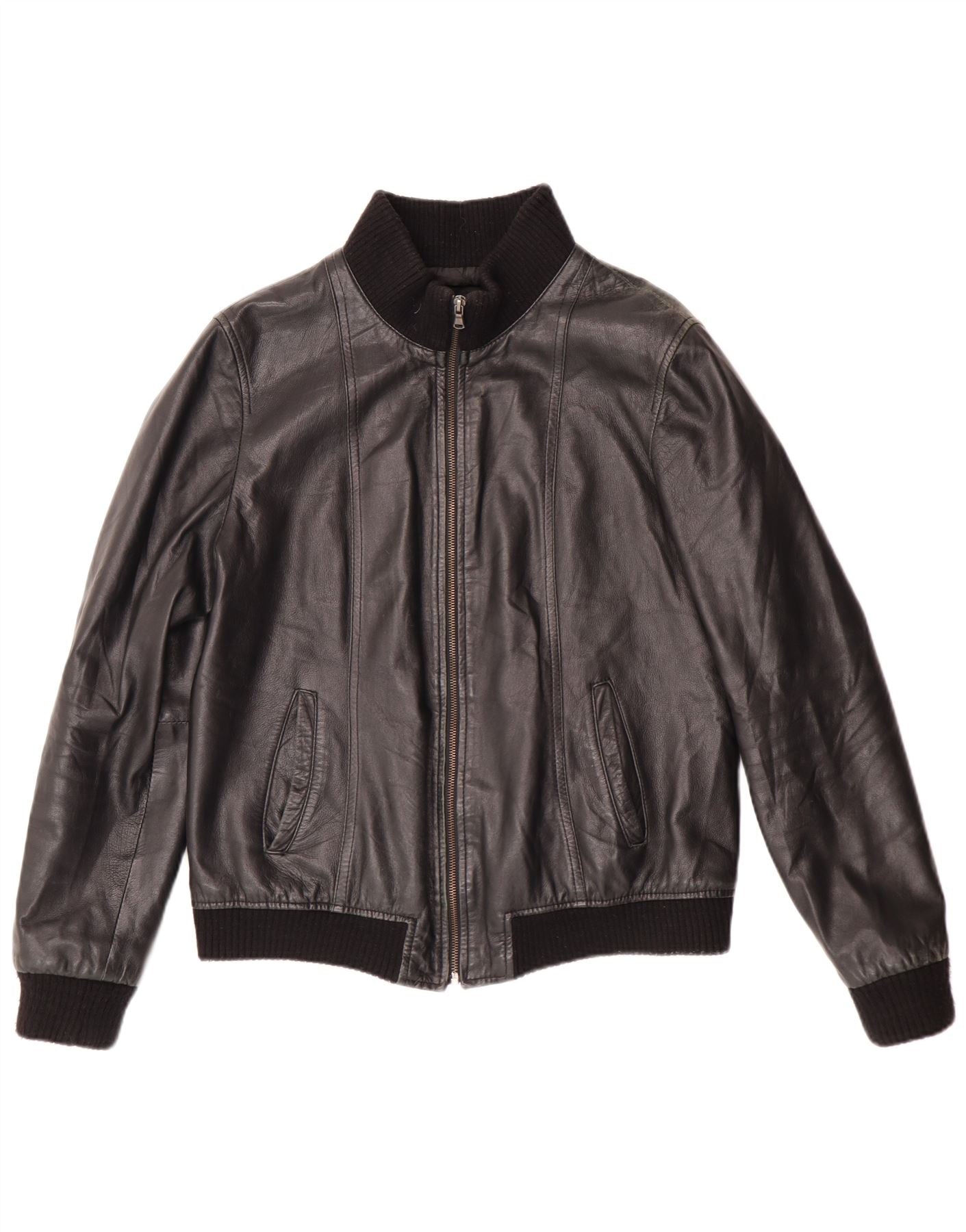 - AI Description: This Talenti mens bomber jacket is crafted from supple black leather, offering a refined texture. It features a classic collared neckline and a full zip closure for a sleek front. Long sleeves and a regular fit ensure comfortable wear. Ribbed cuffs and hem provide a structured silhouette. The jacket includes practical pockets and a quilted lining for added warmth and detail.