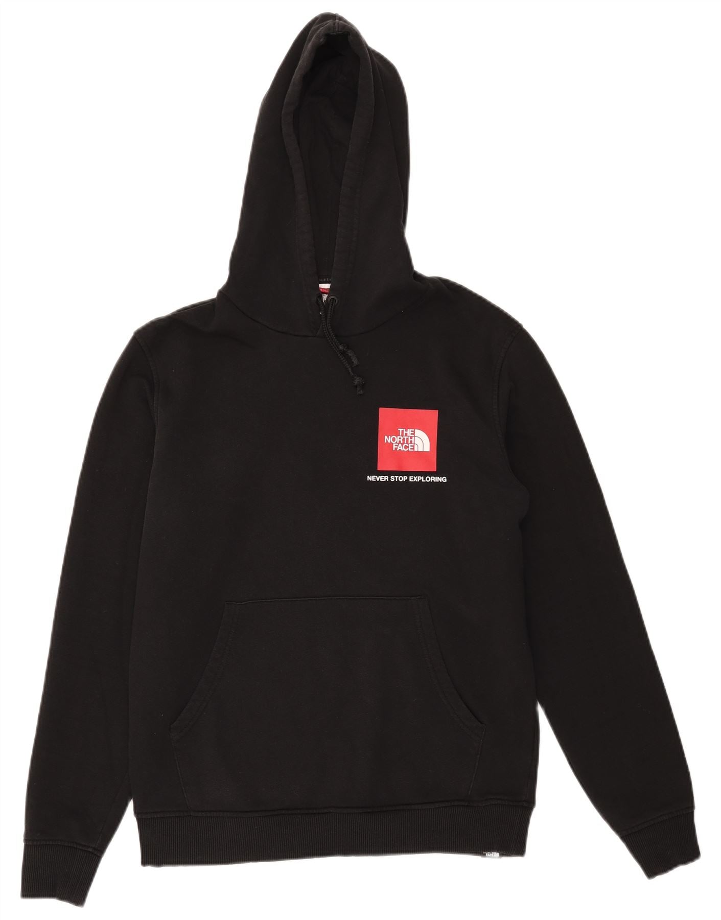 - AI Description: This The North Face mens hoodie jumper is crafted from a comfortable black cotton blend jersey. It features a classic pullover design with a hooded neckline and long sleeves. The regular fit ensures ease of movement. A prominent red box logo graphic adorns the chest. Cuffed sleeves and a practical kangaroo pocket complete the design.