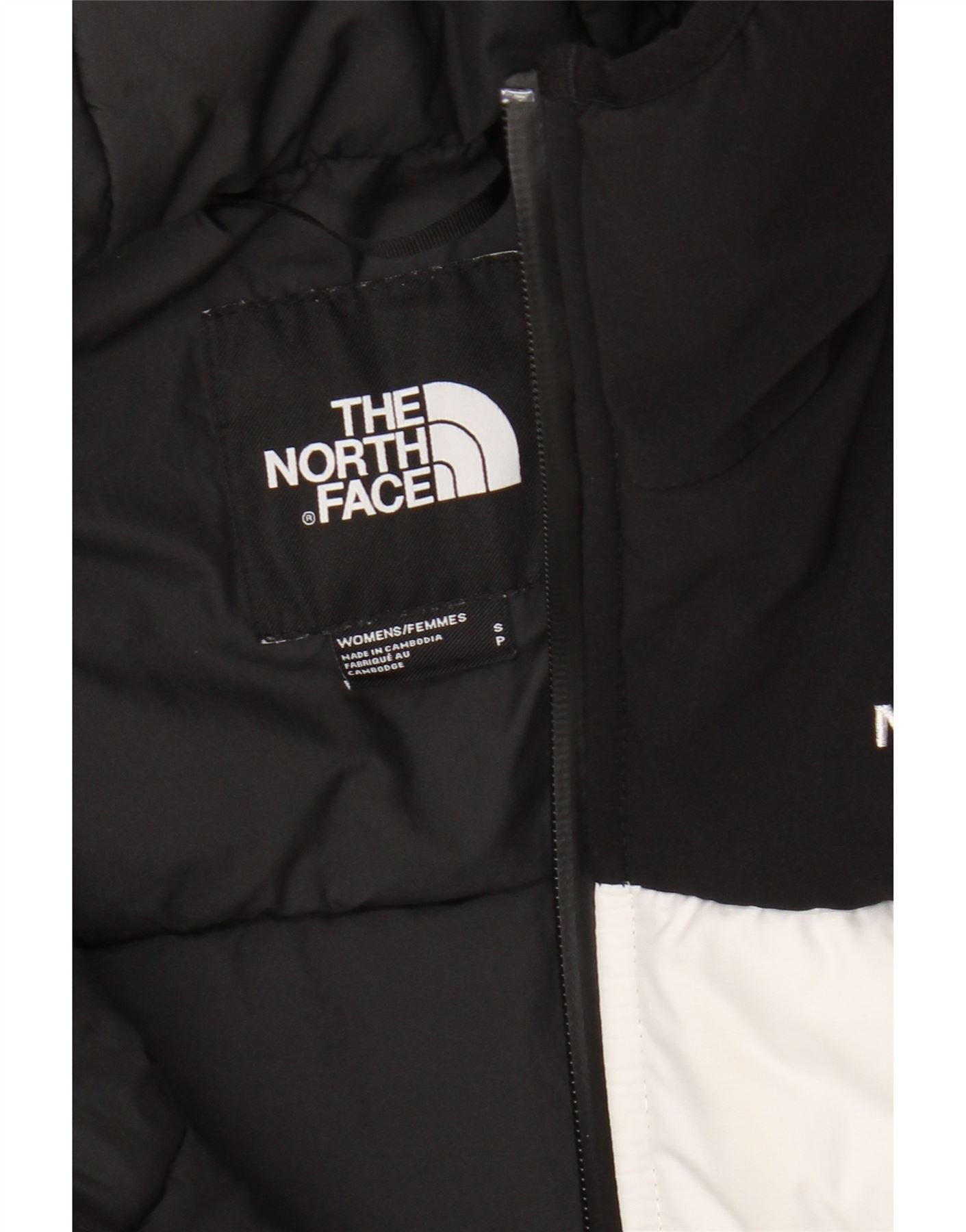 - AI Description: This The North Face womens padded jacket is crafted from a blended fabric with a distinct padded texture. It features a modern colourblock design in crisp white and black. The regular fit offers comfortable wear. A high neck and full zip closure provide warmth. It includes a practical hood and zipped pockets for functionality. Long sleeves complete the design. The iconic brand logo adds a signature touch.
