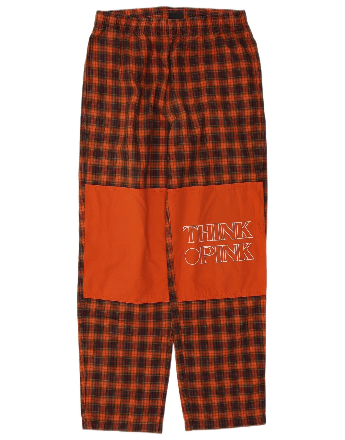 - AI Description: These Think Pink mens trousers are crafted from 100 percent woven cotton, offering a comfortable feel. They feature a vibrant orange plaid pattern, blending shades of red and brown. The relaxed fit and pull on style ensure ease of wear. An elasticated waist provides comfort. Practical pockets are included. A distinctive orange panel on the leg features a 'Think Pink' graphic logo, adding a retro touch.