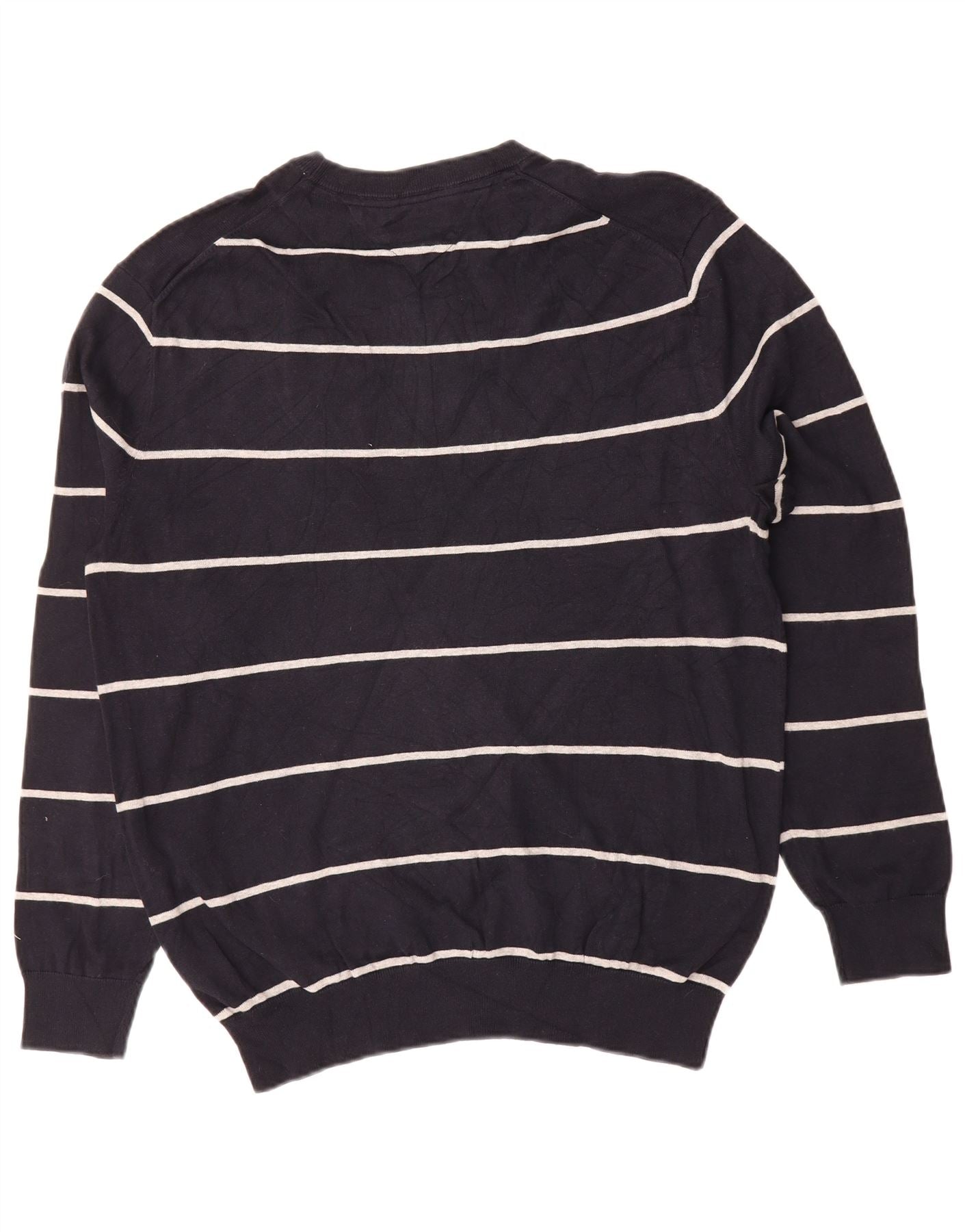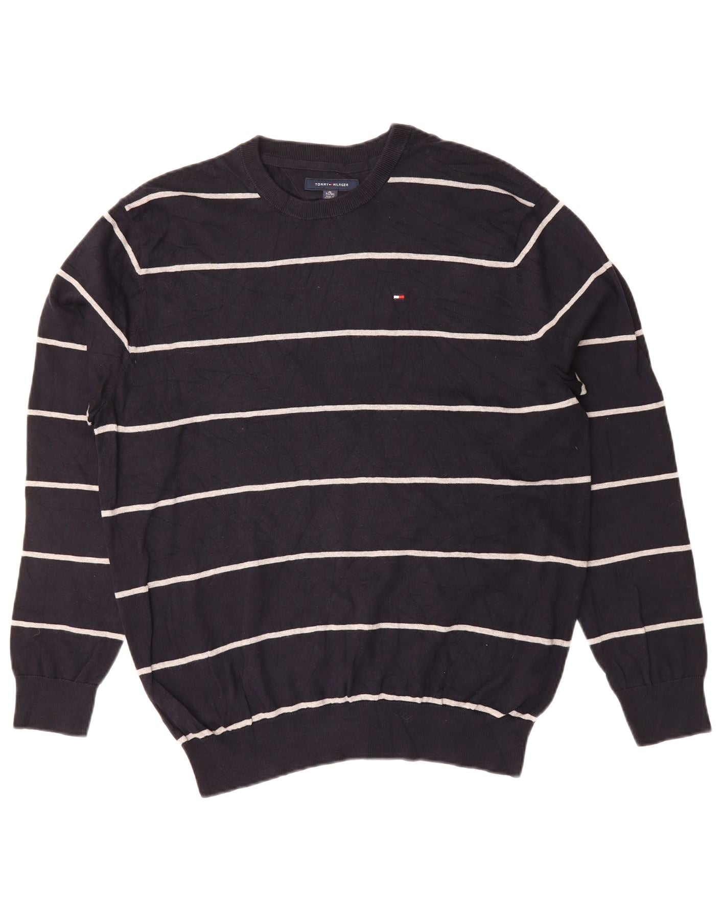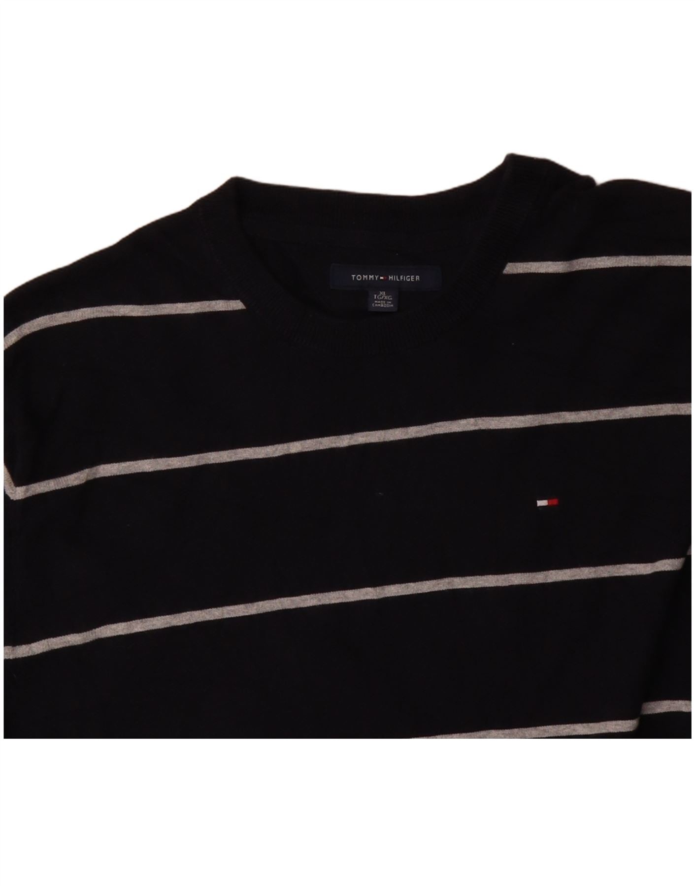 TOMMY HILFIGER Mens Crew Neck Jumper Sweater XL Black Striped Cotton