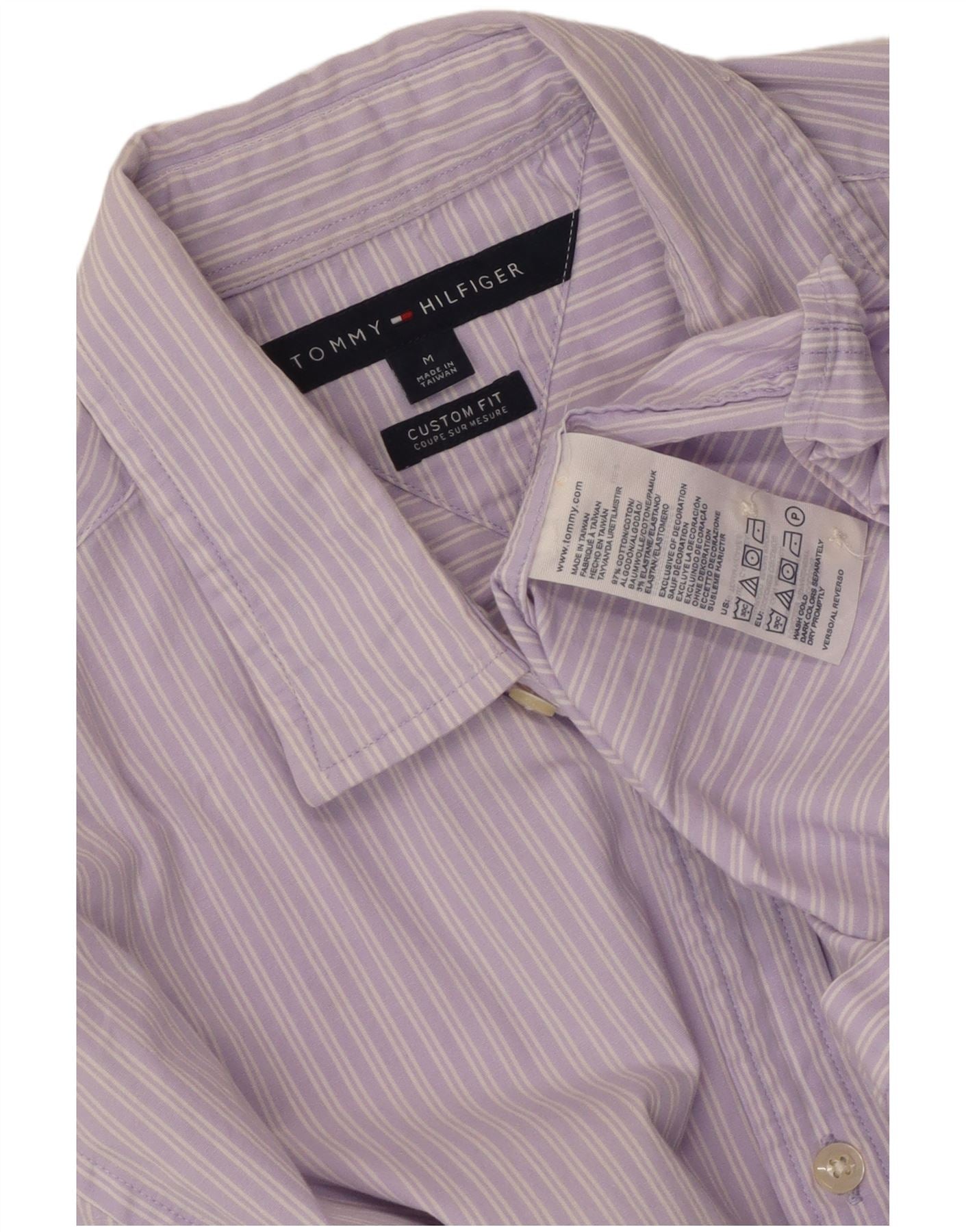 - AI Description: This Tommy Hilfiger mens shirt is crafted from a lilac cotton blend fabric with a subtle stretch. It features a classic candy stripe pattern. The collared neckline and button-up front offer a timeless look. Long sleeves finish with buttoned cuffs. A custom fit provides a tailored silhouette. A small embroidered logo adds a signature touch.