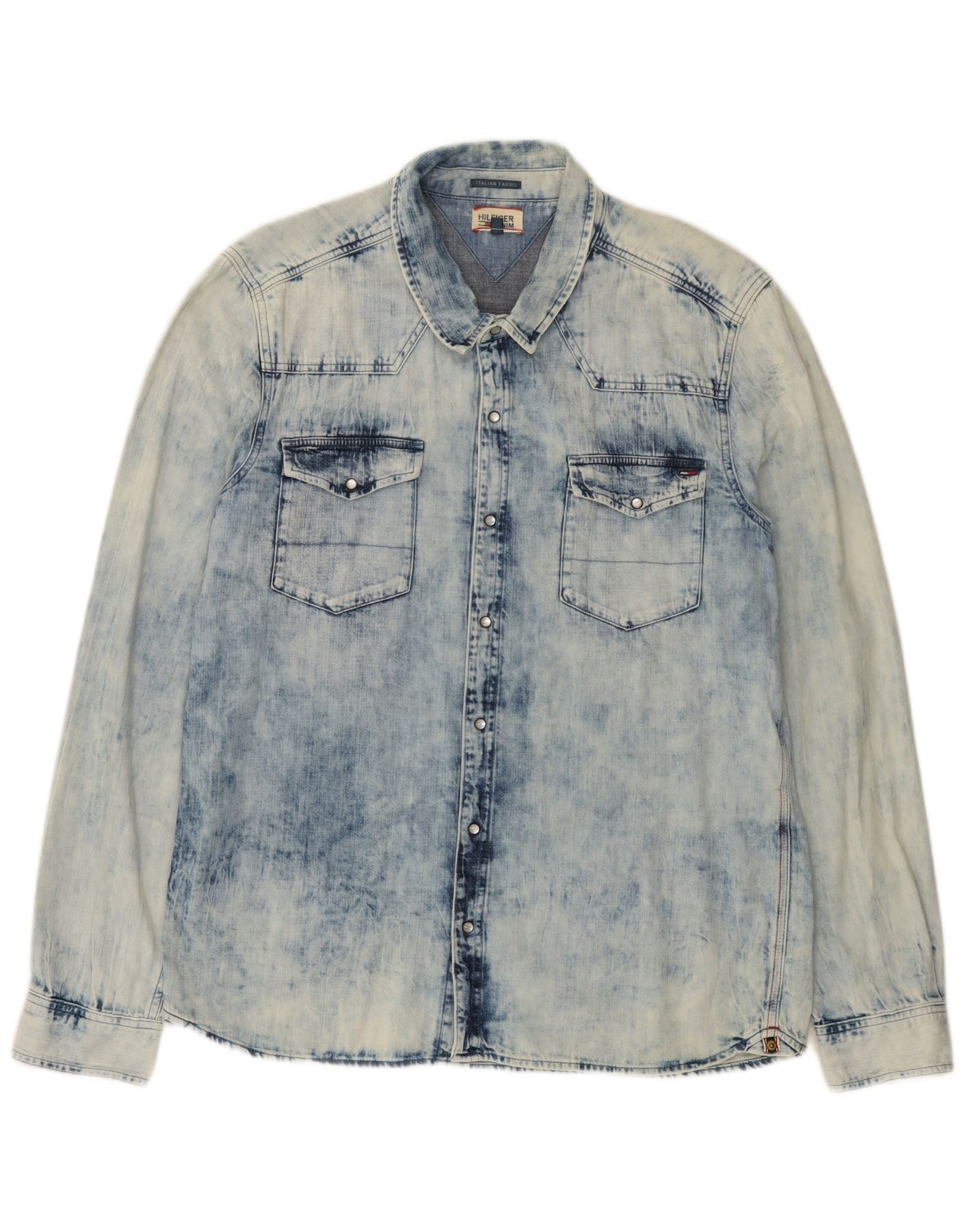 - AI Description: This Tommy Hilfiger mens denim shirt is crafted from 100 cotton denim with a distinctive blue acid wash finish. It features a classic collared neckline and long sleeves. The Western style is evident with snap button closures and twin chest pockets. A regular fit ensures comfortable wear, making it a versatile addition to any casual wardrobe. The acid wash provides a unique, textured look.
