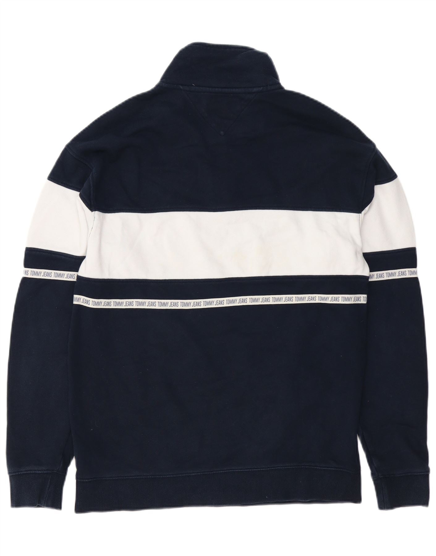 - AI Description: This Tommy Hilfiger mens sweatshirt jumper is crafted from soft jersey fabric in a striking navy blue and white colourblock design. It features a high collared neckline with a practical quarter zip closure. Long sleeves and a regular fit ensure comfort and a classic silhouette. A subtle logo accent and spell-out detailing on the white stripe add signature branding.