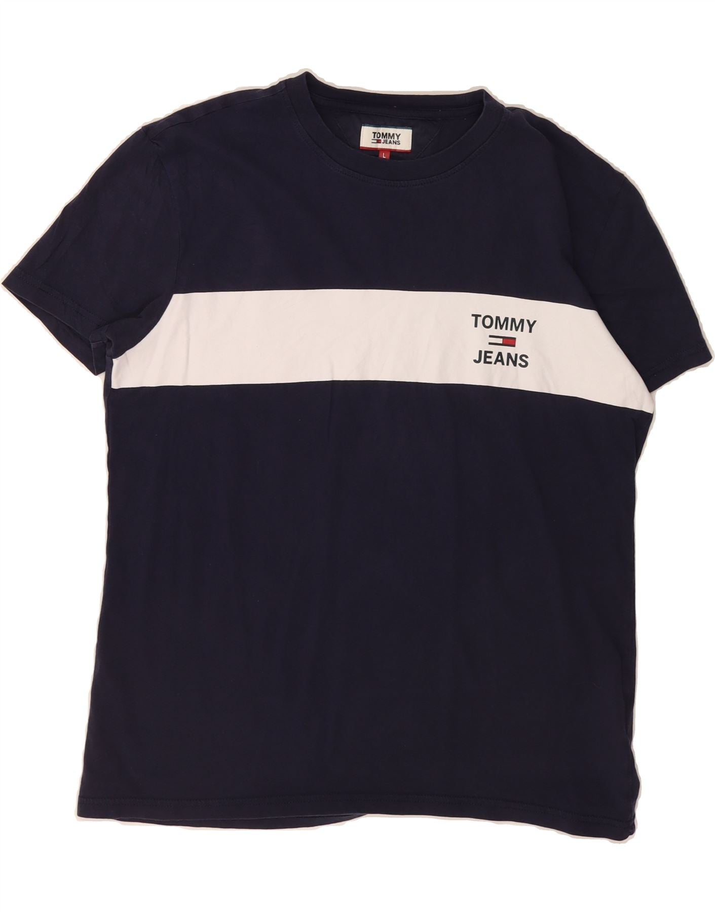 TOMMY HILFIGER Mens Graphic T-Shirt Top Large Navy Blue Colourblock Cotton