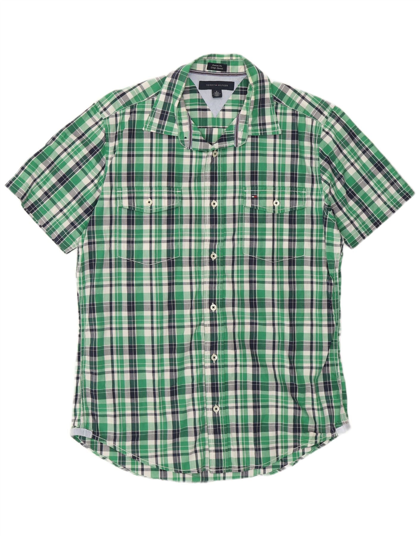 - AI Description: This Tommy Hilfiger mens shirt is crafted from 100 percent cotton woven fabric. It features a vibrant green, navy, and white plaid pattern. The collared neckline and button-up front offer a classic, smart casual look. Short sleeves and a custom fit ensure comfort and a tailored silhouette. Two chest pockets with button closures add practical detail. This shirt combines timeless style with a fresh, modern aesthetic, perfect for everyday wear.