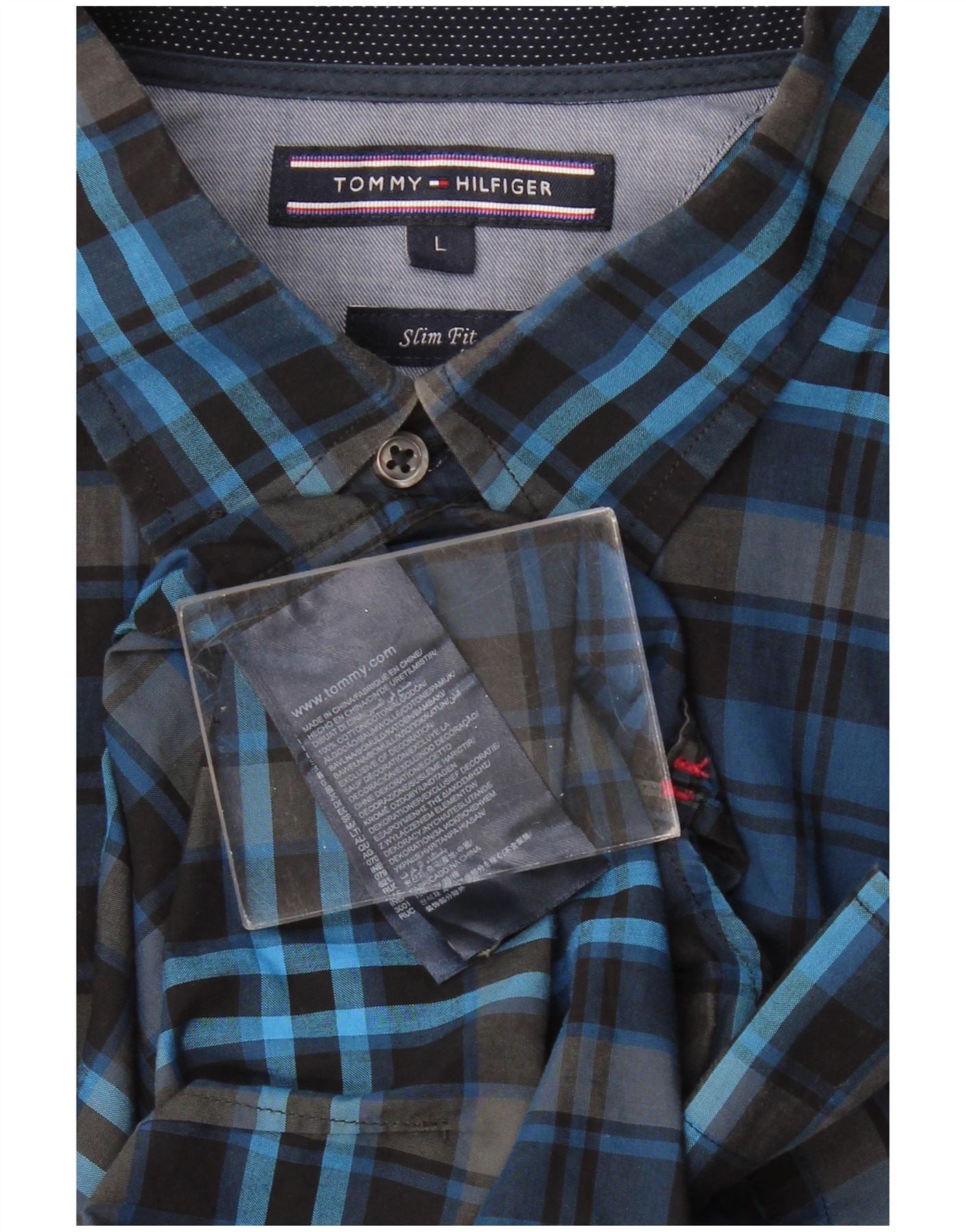 - AI Description: This Tommy Hilfiger mens flannel shirt is crafted from soft 100 cotton woven fabric. It features a classic blue and black plaid pattern. The collared neckline and full button-up front offer a traditional look. Long sleeves finish with neat buttoned cuffs. A subtle logo accent adds brand recognition. The slim fit provides a modern, tailored silhouette. It also includes practical pockets.
