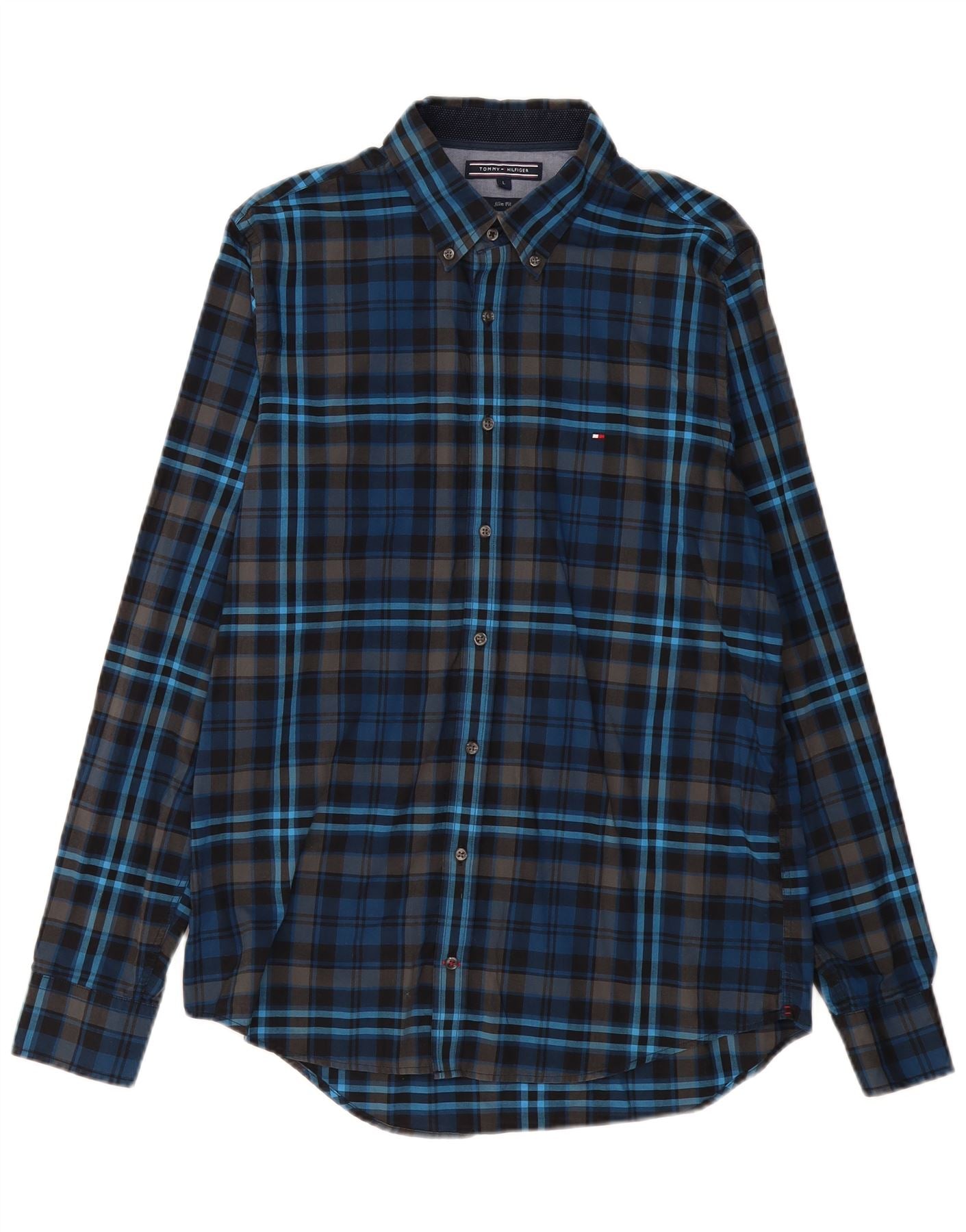TOMMY HILFIGER Mens Slim Fit Shirt Large Navy Blue Check Cotton
