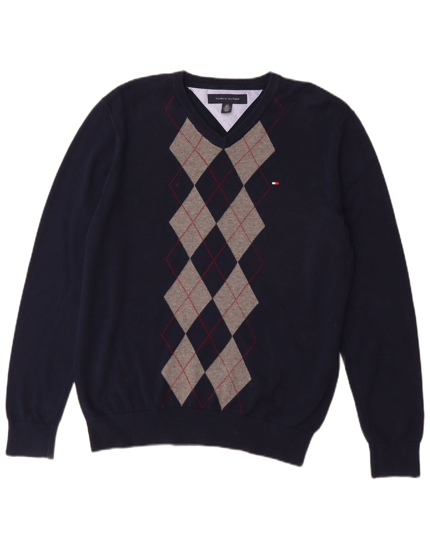TOMMY HILFIGER Mens V-Neck Jumper Sweater Small Navy Blue Argyle/Diamond