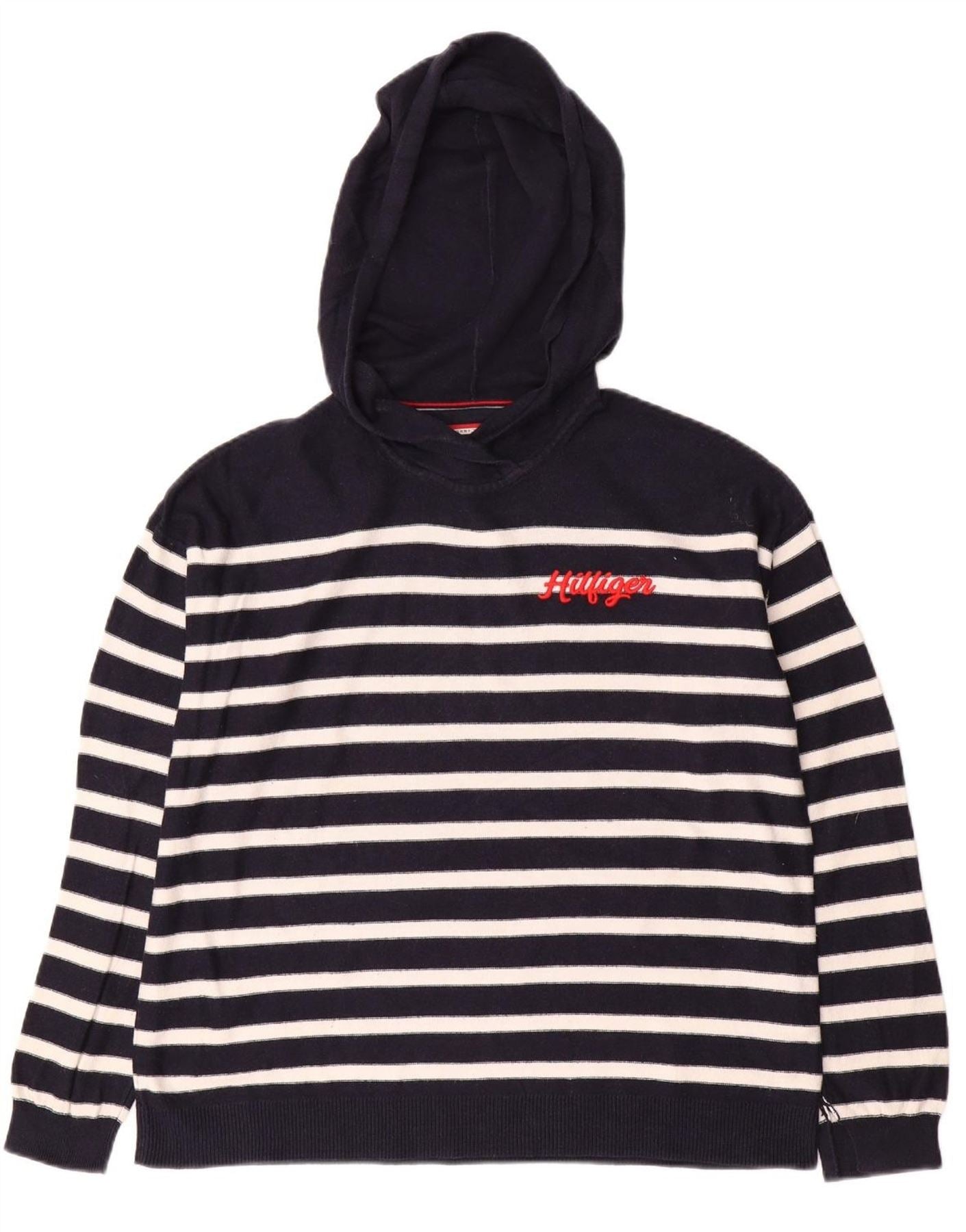 TOMMY HILFIGER Womens Hooded Jumper Sweater UK 14 Medium Navy Blue Striped