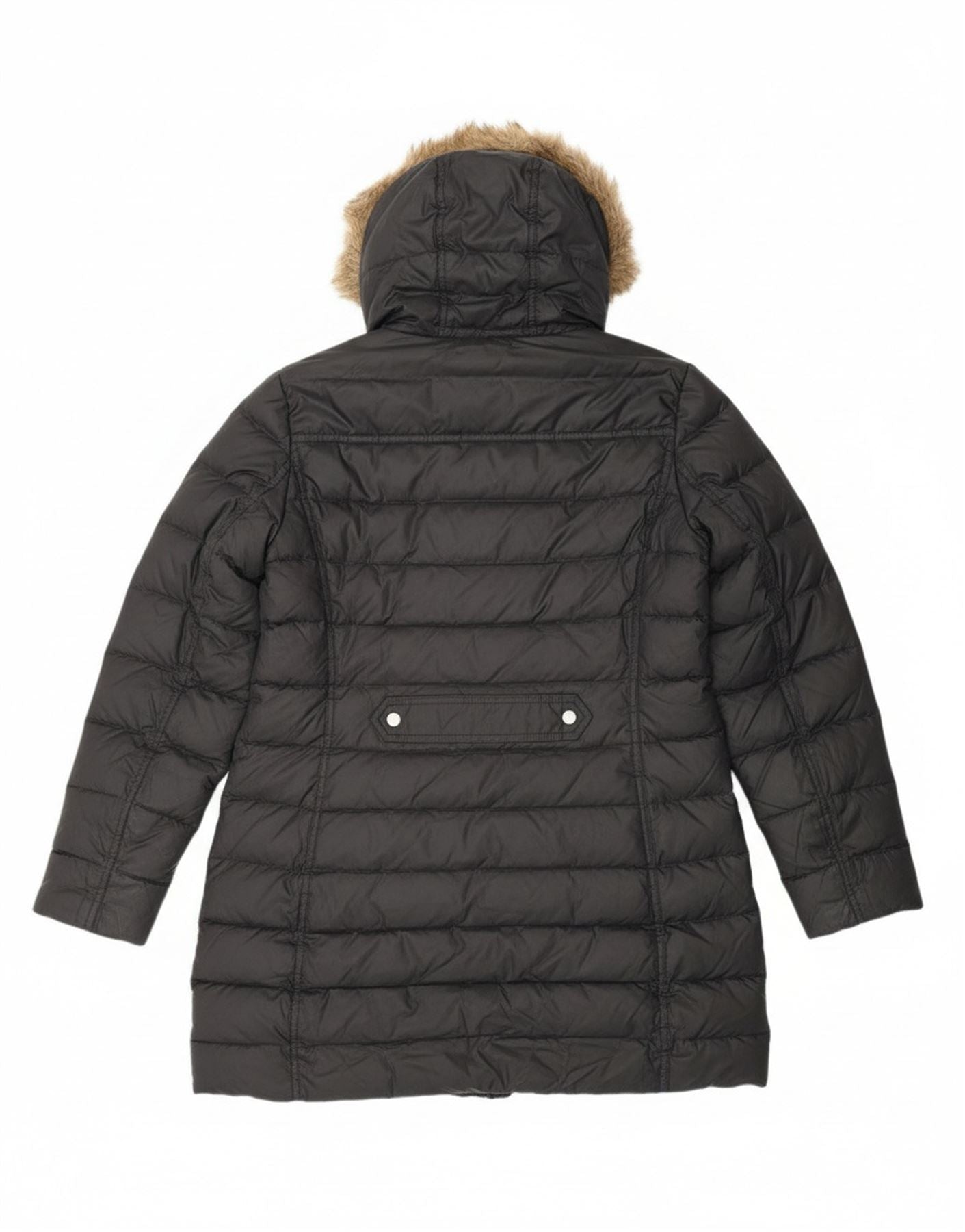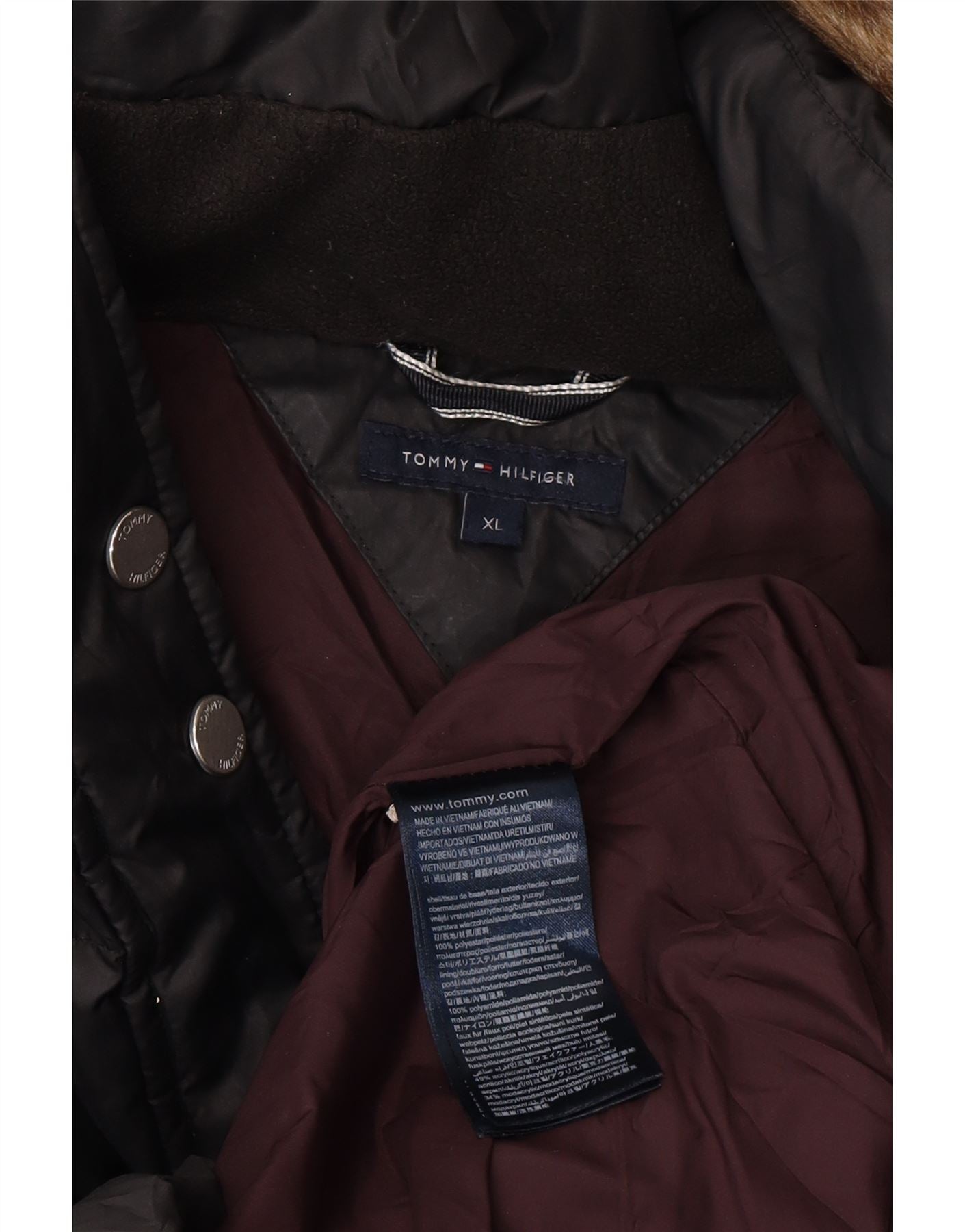 - AI Description: This Tommy Hilfiger womens padded coat is crafted from 100 percent polyester, offering a smooth woven texture and thermal warmth. It features a high neck and a button closure for a secure fit. The hooded design is accented with a faux fur trim, adding a luxurious touch. Long sleeves and a regular fit provide comfort and style for winter weather. Practical pockets complete this functional yet fashionable piece.
